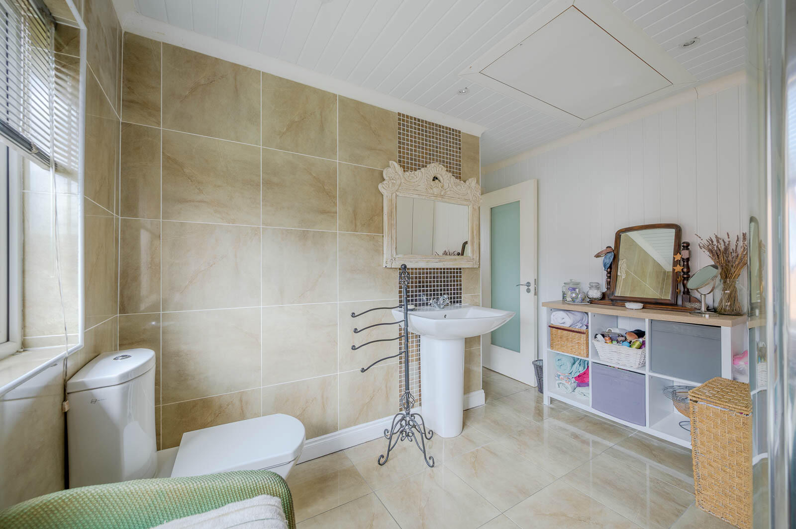 Three piece suite comprising built-in fully tiled shower cubicle, low flush WC, pedestal wash hand basin, mixer tap, fully tiled floor, three walls fully tiled, fourth wall and ceiling Upvc panelling, access to roofspace (light and power) via slingsby ladder, extractor fan.