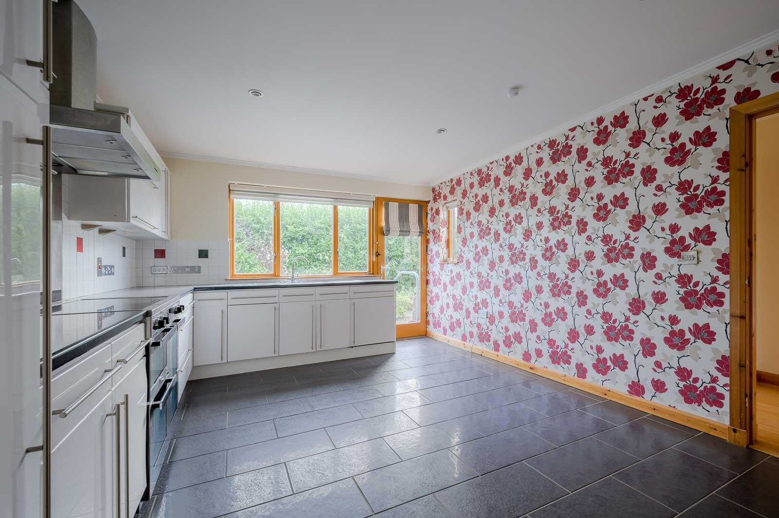 With range of high and low level units, stainless steel sink and drainer, chrome mixer tap, space for washing machine and access door to rear garden.