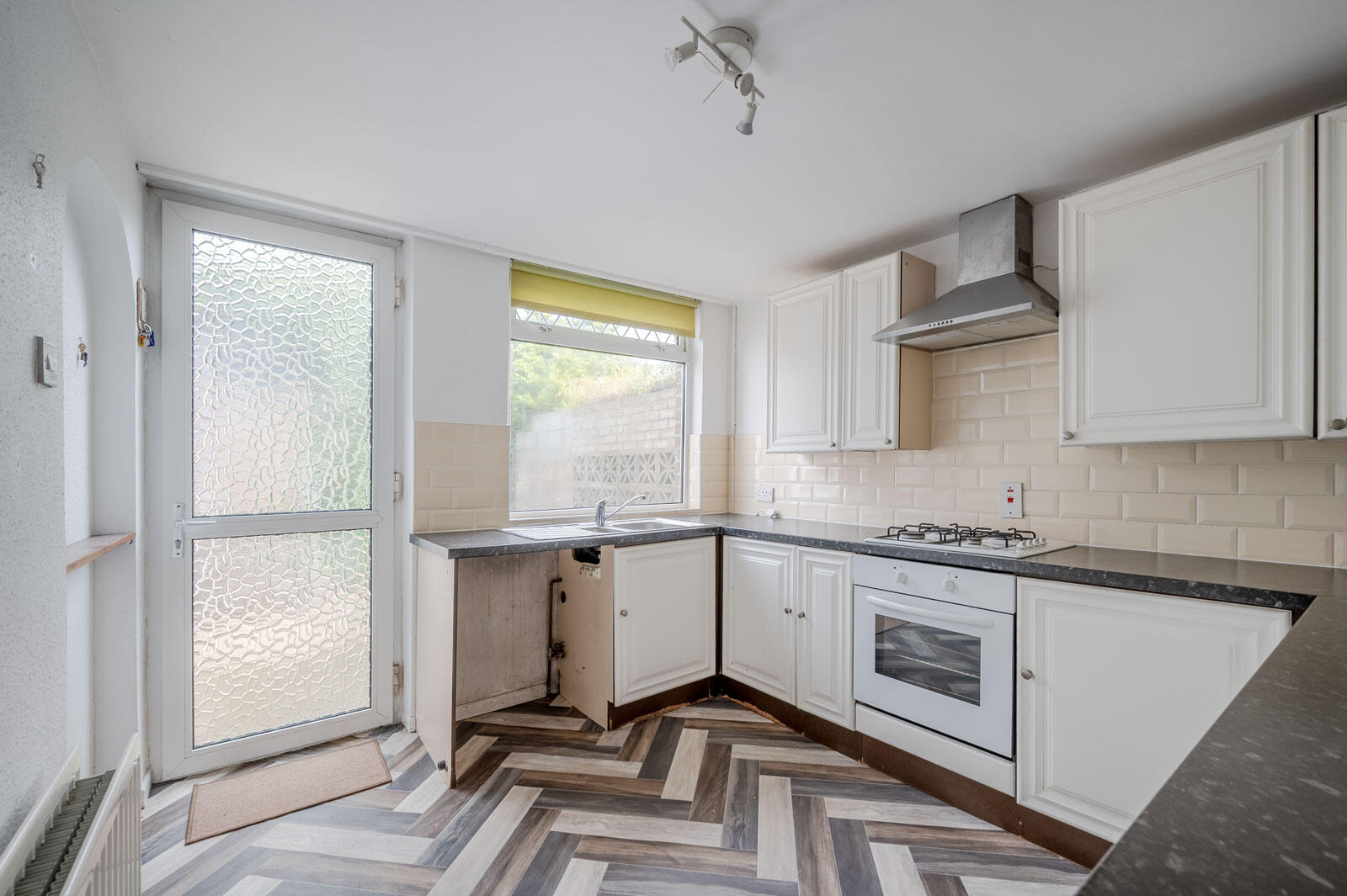 With range of high and low level units, space for dryer, stainless steel sink and a half with drainer, chrome mixer taps, outlook to rear, integrated oven, four ring gas hob, stainless steel extractor above, subway style partial tiling, glazed display cabinetry, lino herringbone effect wood effect floor with access to rear garden.
