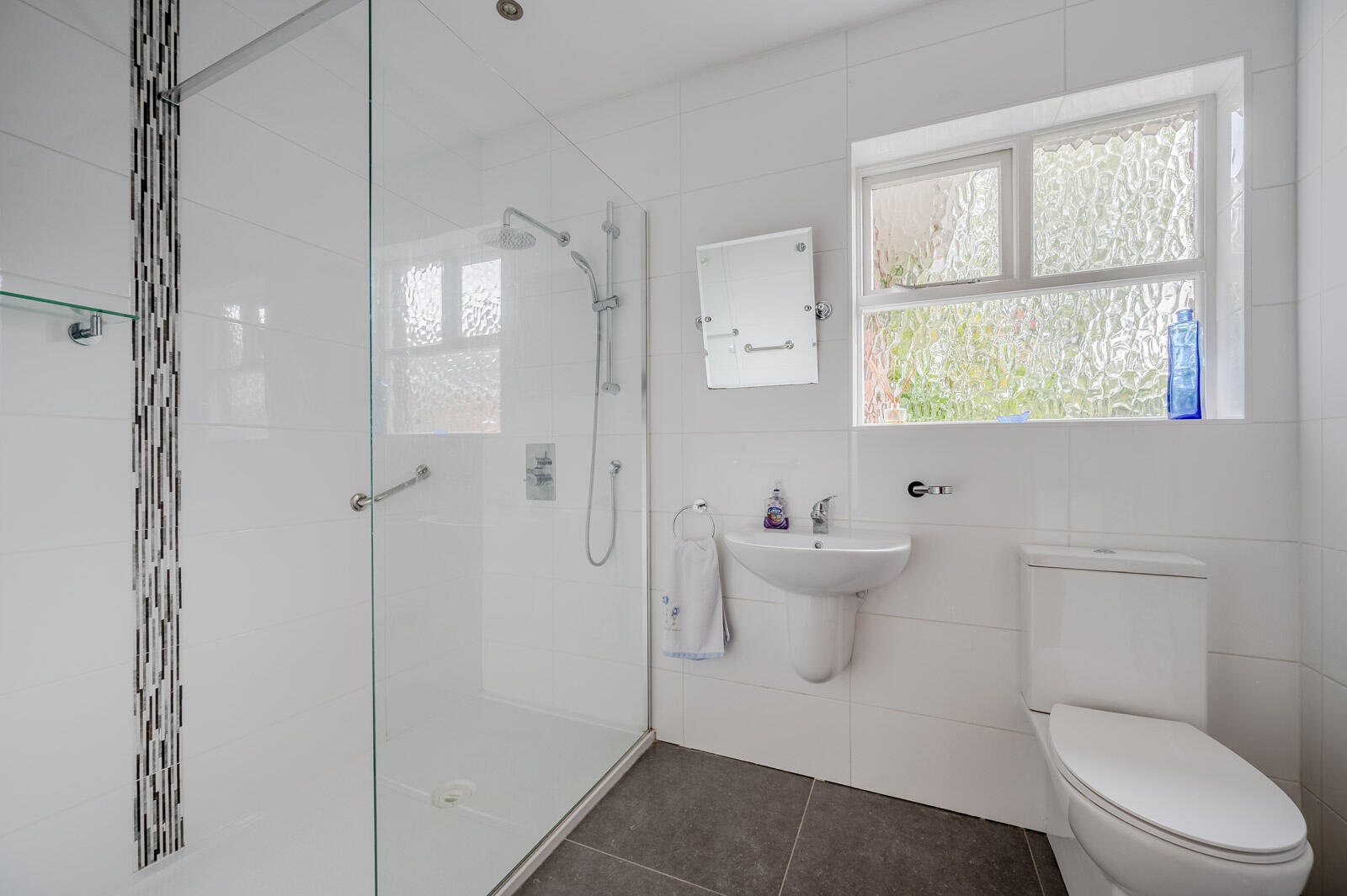 Three piece comprising shower cubicle, floating wash hand basin, mixer tap, low flush WC, fully tiled floor, fully tiled walls, chrome heated towel rail.