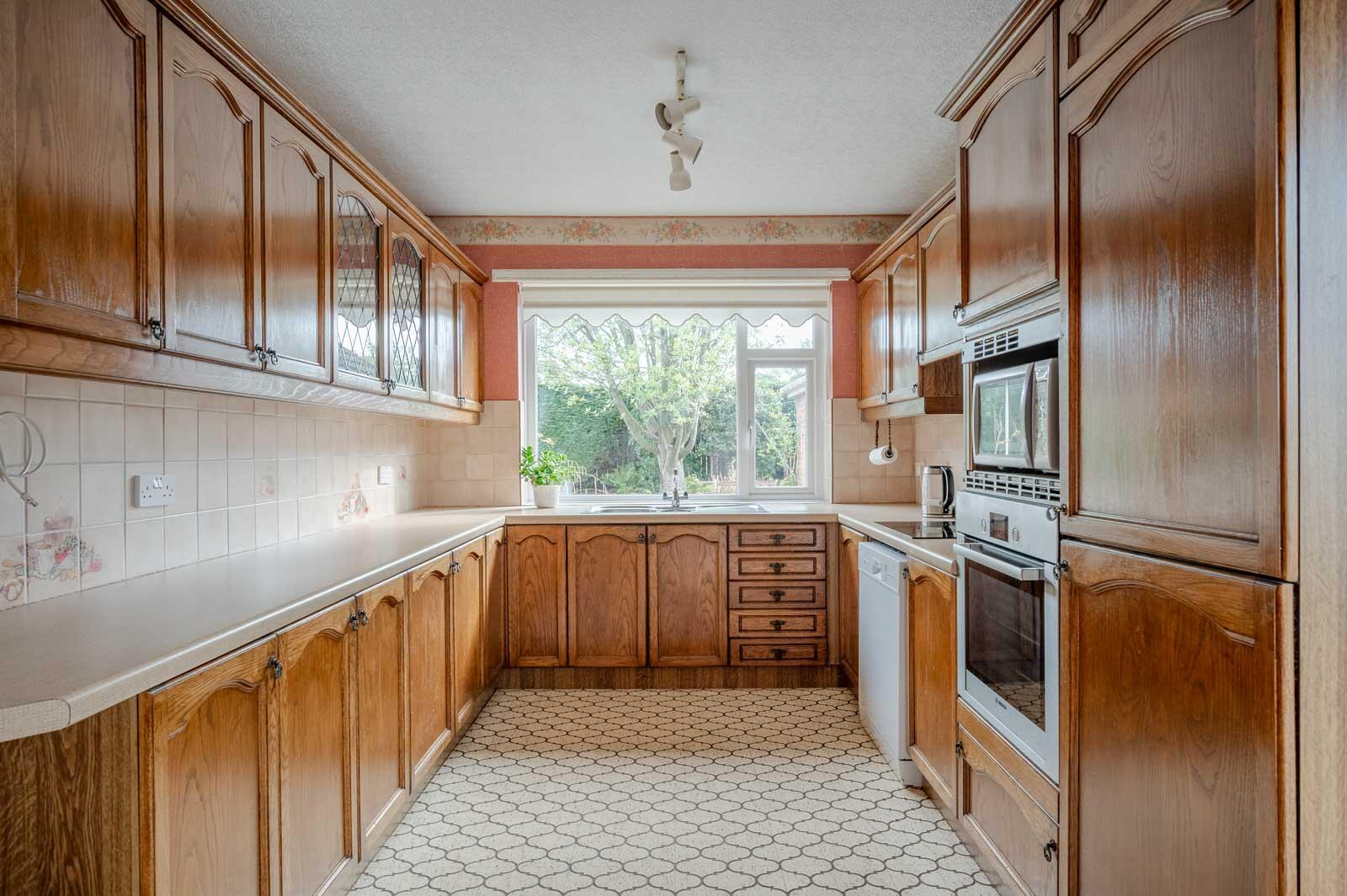 Range of high and low level solid wooden units, laminate work surfaces, one and a half bowl single drainer stainless steel sink unit, mixer tap, integrated Bosch oven, integrated four ring hob, tiled splashback, extractor fan above, plumbed for dishwasher, integrated fridge freezer, glass display cabinets, part tiled walls, aspect to rear garden, uPVC double glazed door to outside.