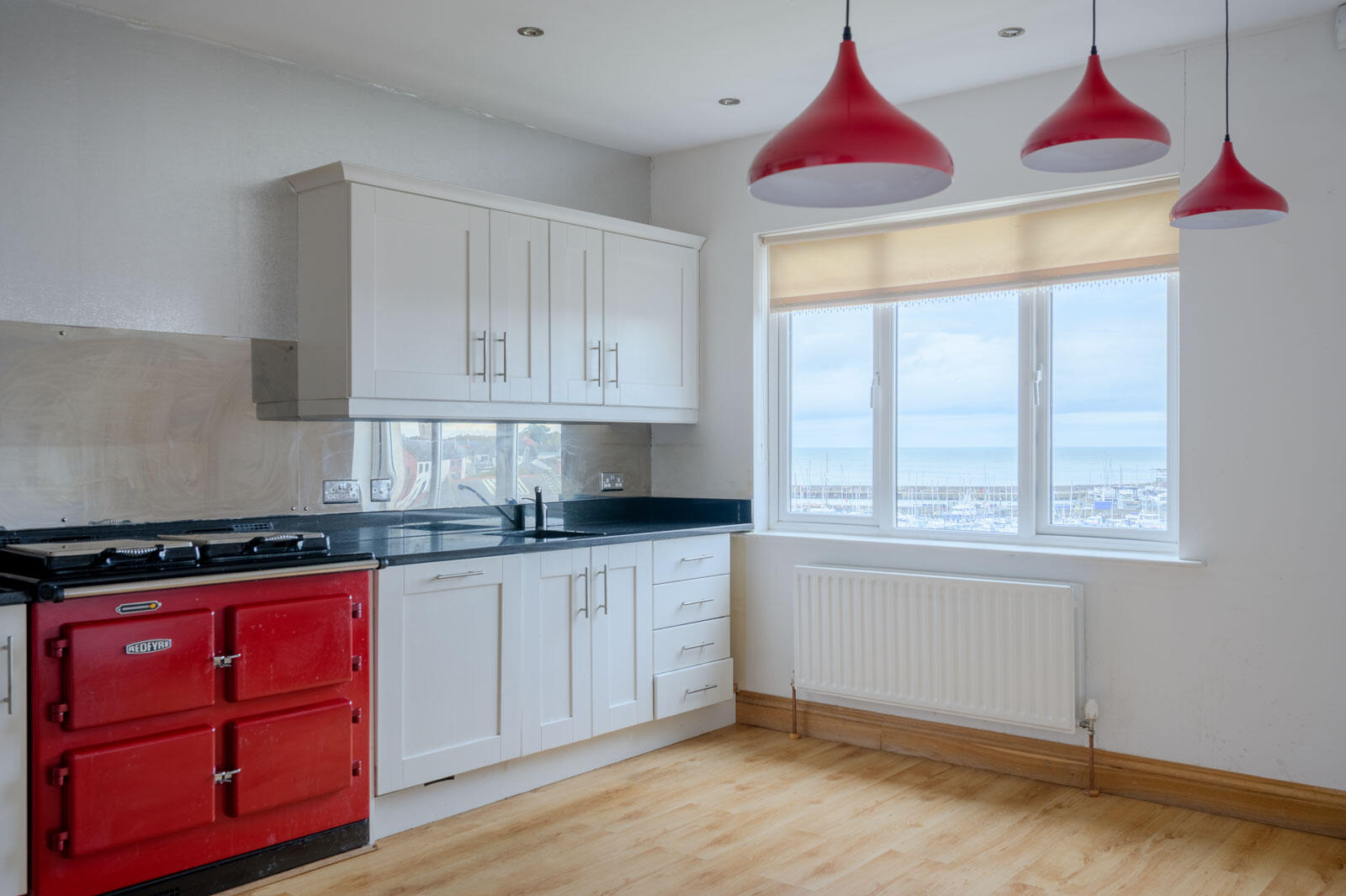 Bespoke fitted kitchen in hand painted Shaker style units, stainless steel fittings, granite work surface and upstand with stainless steel splashback, integrated four ring stainless steel gas hob, oven below, stainless steel extractor hood above, Redfyre electric range cooker with two hot plates and electric ovens below, integrated dishwasher, inset stainless steel sink unit with chrome mixer taps, concealed down lighting, integrated fridge freezer and Butler´s pantry, oak laminate wooden flooring, ample dining or living space with breathtaking elevated views across Bangor and Queen´s Parade to Bangor Marina and Harbour to Bangor and Ballyholme Bay, the Irish Sea and Scotland beyond.