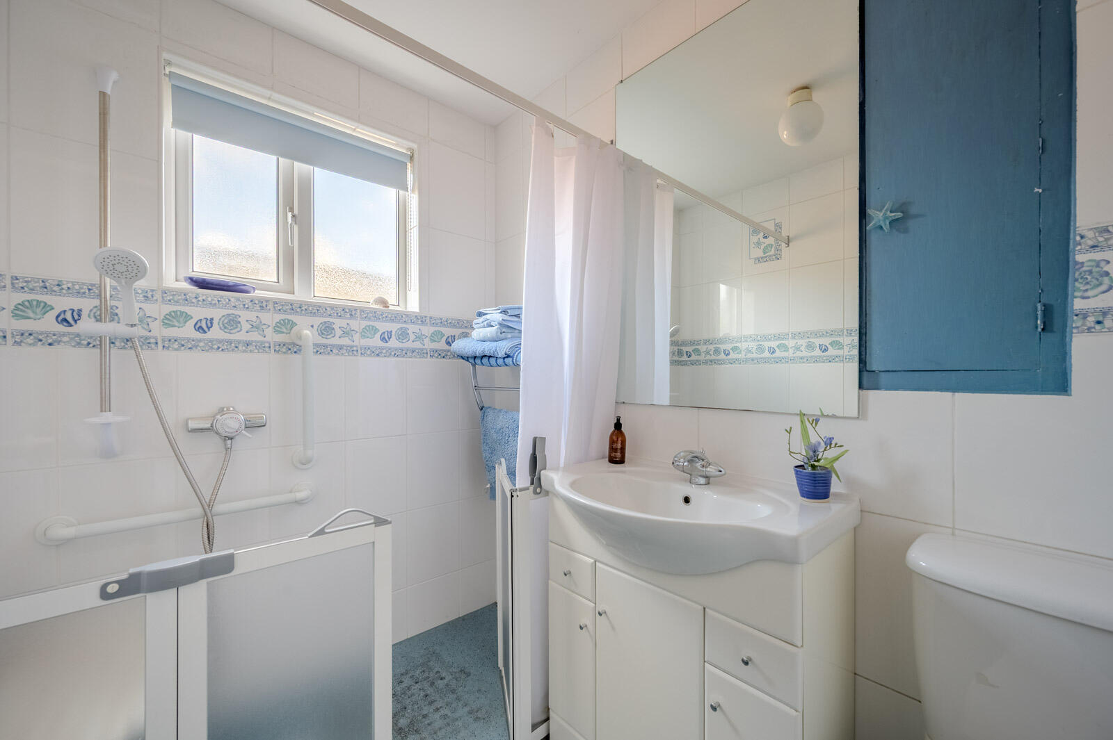 Comprising shower cubicle, wash hand basin with storage beneath, mixer tap, low flush WC, fully tiled walls.