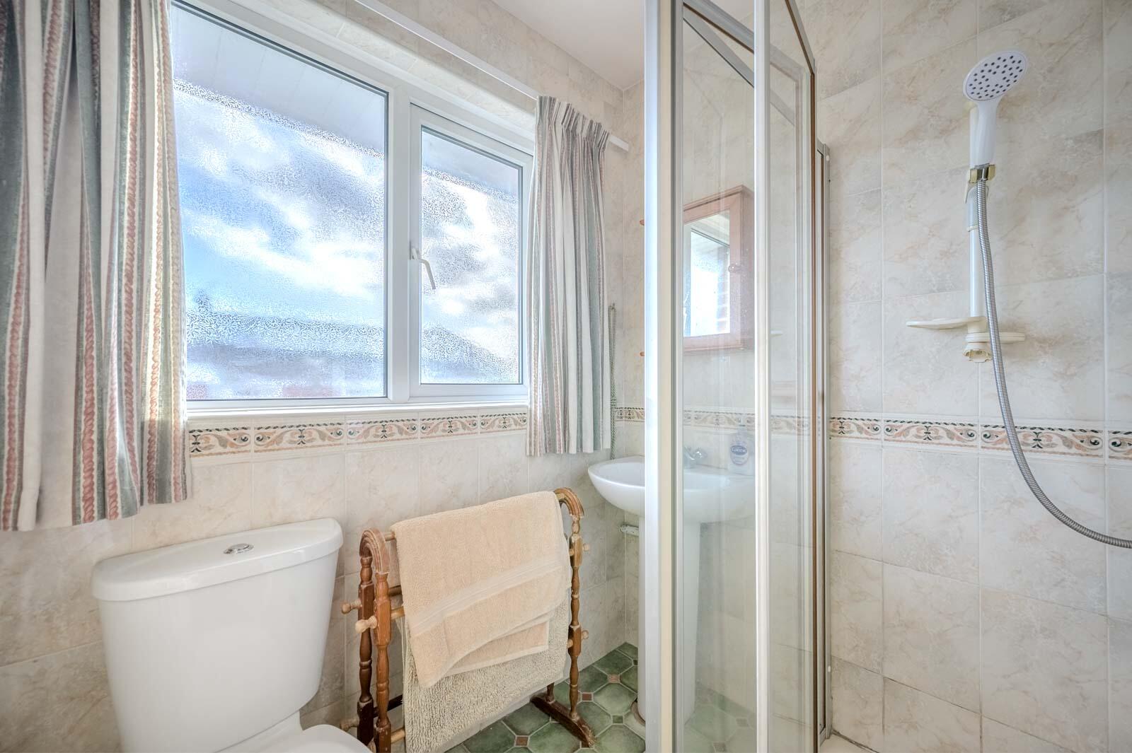 Three piece suite comprising built-in fully tiled shower cubicle, pedestal wash hand basin with mixer tap, low flush WC, fully tiled walls.