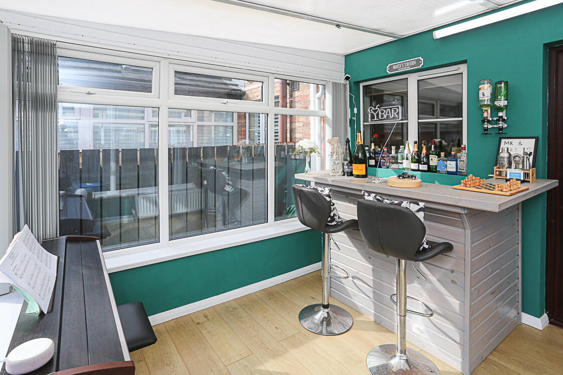 With laminate wood effect floor, tri-aspect windows with outlook to rear and access to rear patio.