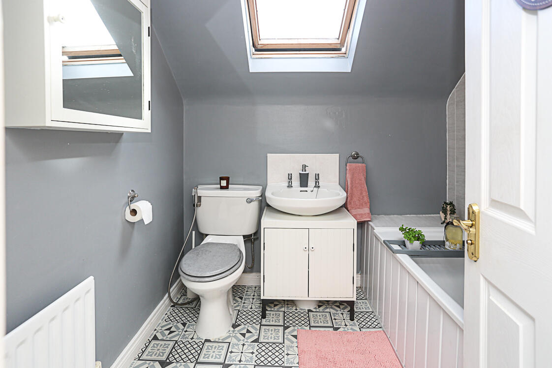 White suite comprising of low flush WC, pedestal wash hand basin with hot and cold taps, tiled splashback, panelled bath with mixer taps, telephone handle attachment, partial uPVC panels to wall, extractor fan, laminate tile effect floor, Velux window.
