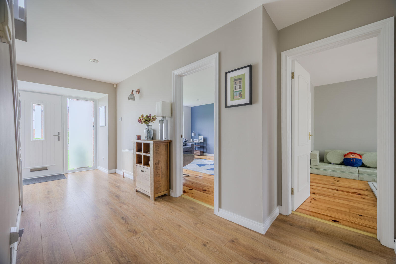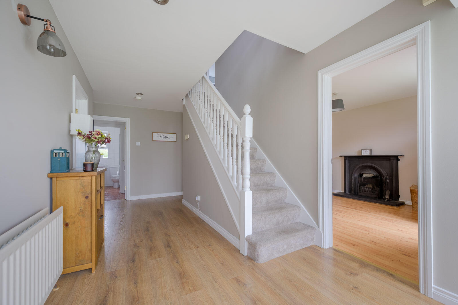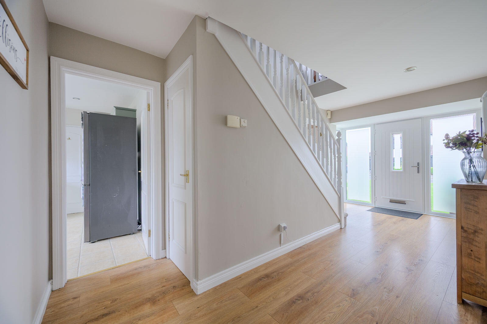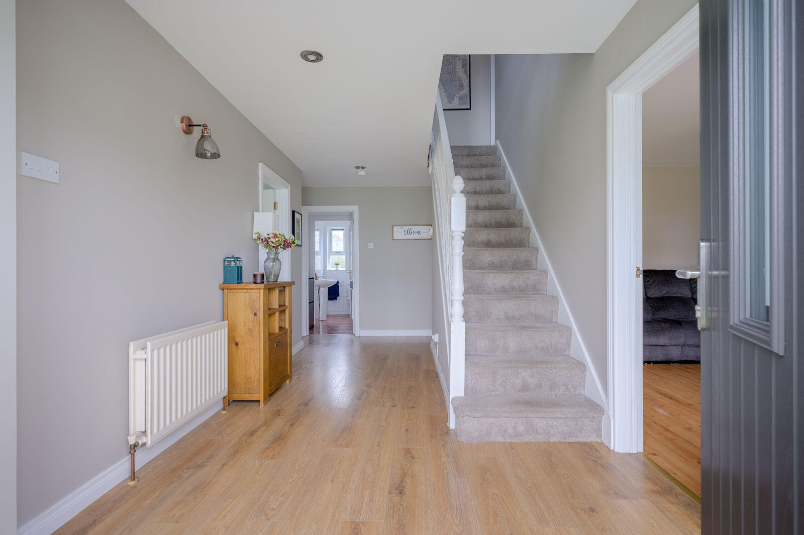 With oak laminate wooden flooring, stainless steel recessed ceiling spotlights, storage cupboard and heating controls under stairs, excellent cloaks storage, walk-in cloaks area and access through to ground floor WC.