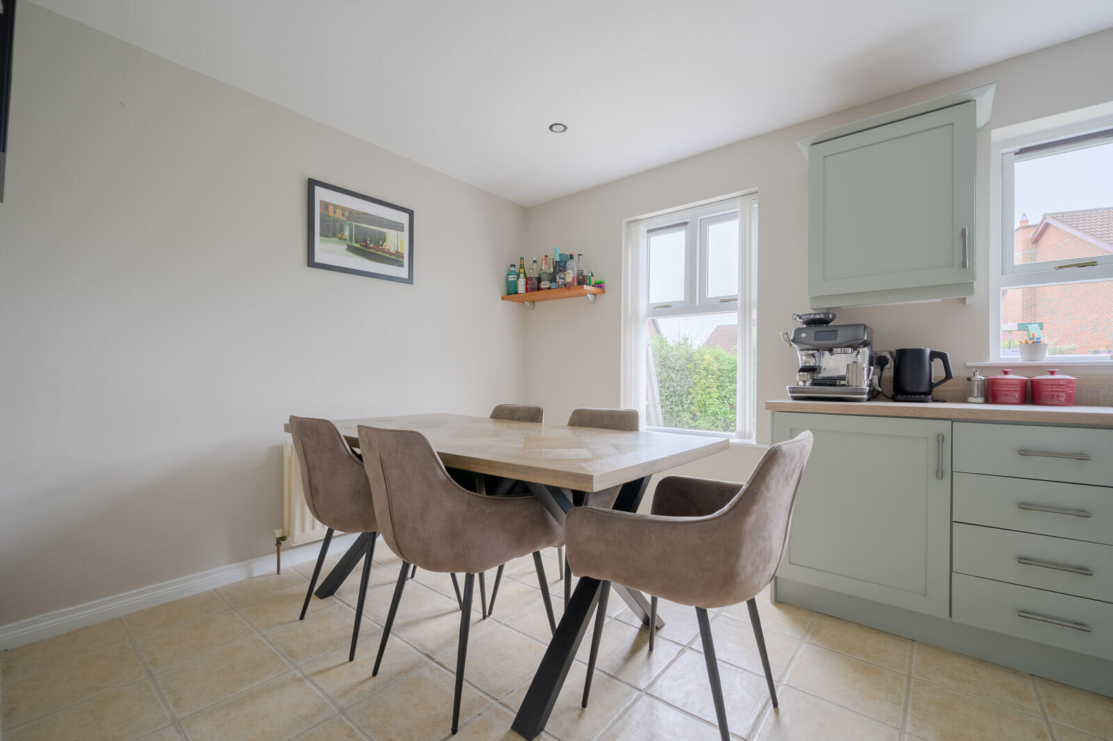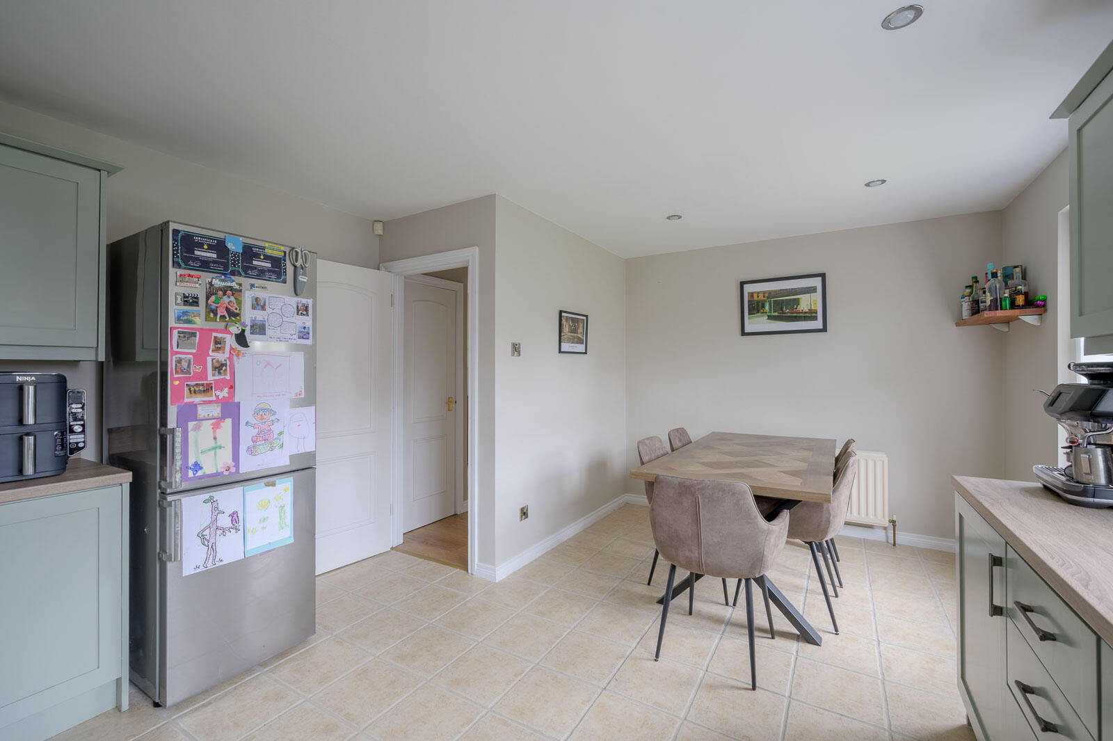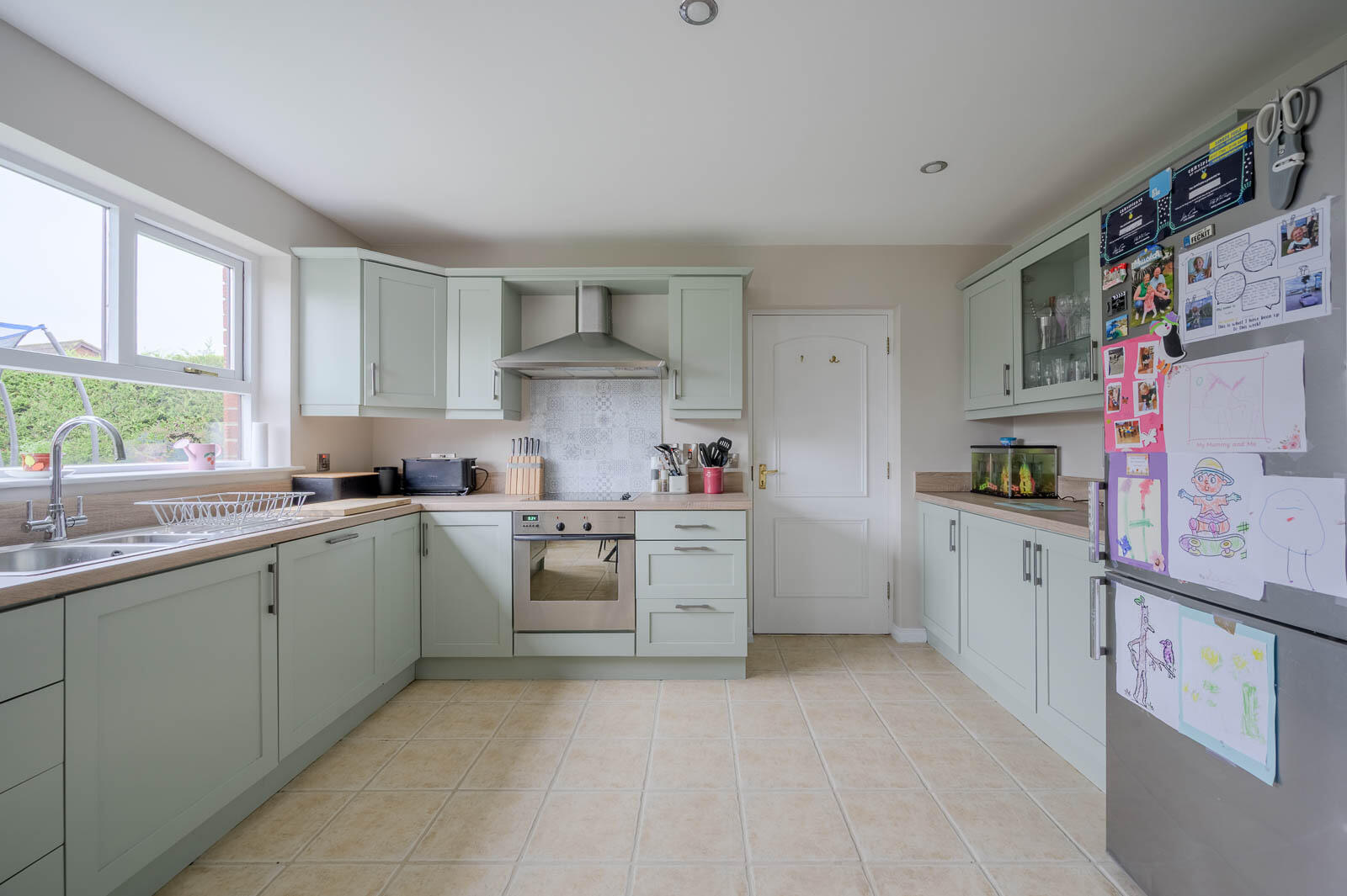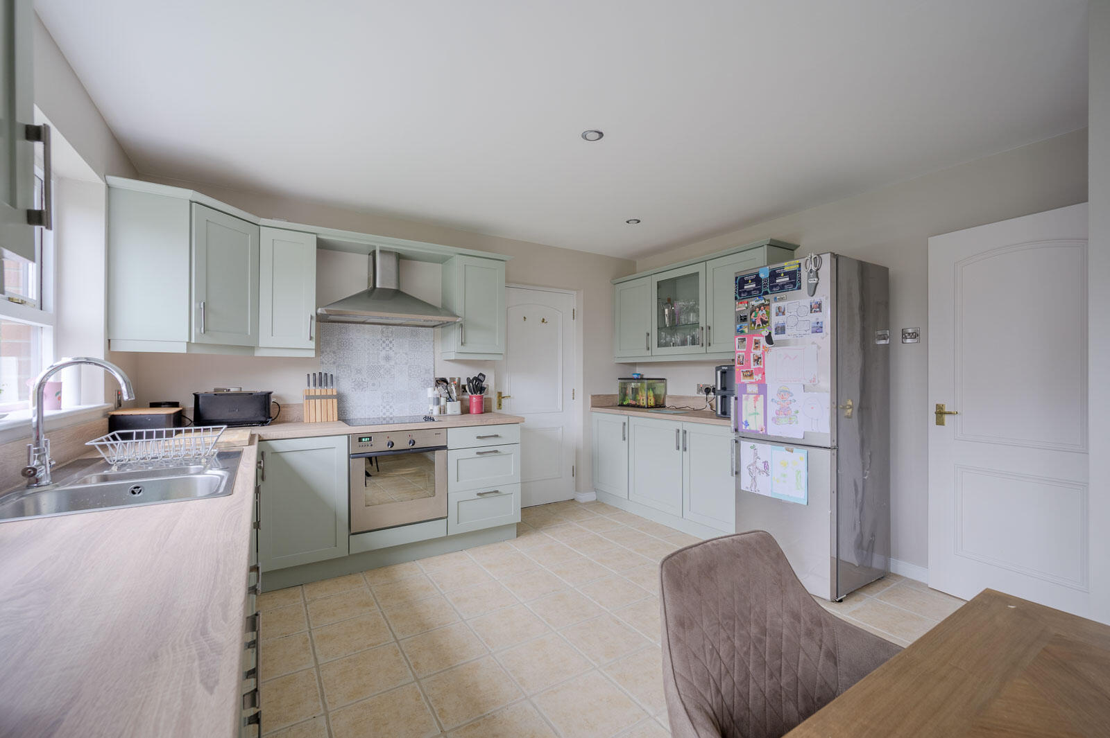 Ceramic tiled floor throughout, chrome recessed ceiling spotlights, bespoke fitted kitchen, hand painted Shaker style, with pewter fittings, laminate work surface, single drainer stainless steel sink and a half sink unit, chrome mixer taps, integrated Miele dishwasher, integrated four ring Bosch hob and stainless steel oven below, feature glass splashback, stainless steel extractor hood, built-in glazed display cabinets, ample dining or living space, outlook to mature well tended rear garden with southerly aspect, stainless steel switches, service door to garage.
