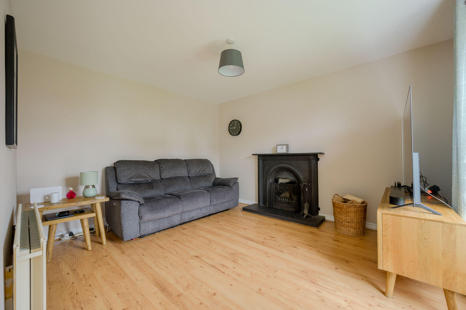 Oak laminate wooden flooring, cast iron fireplace and tiled hearth, open fire, mature outlook to front.