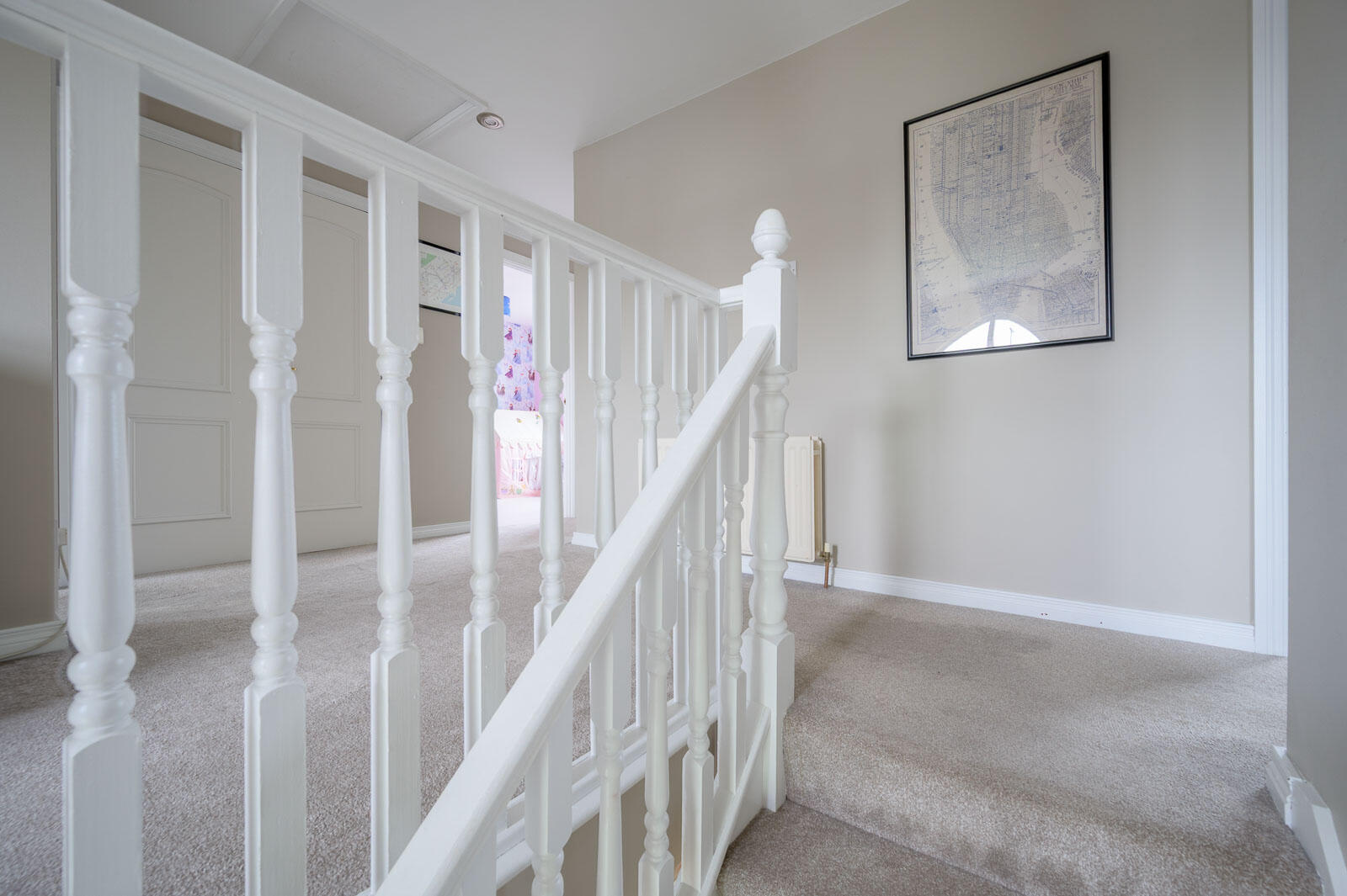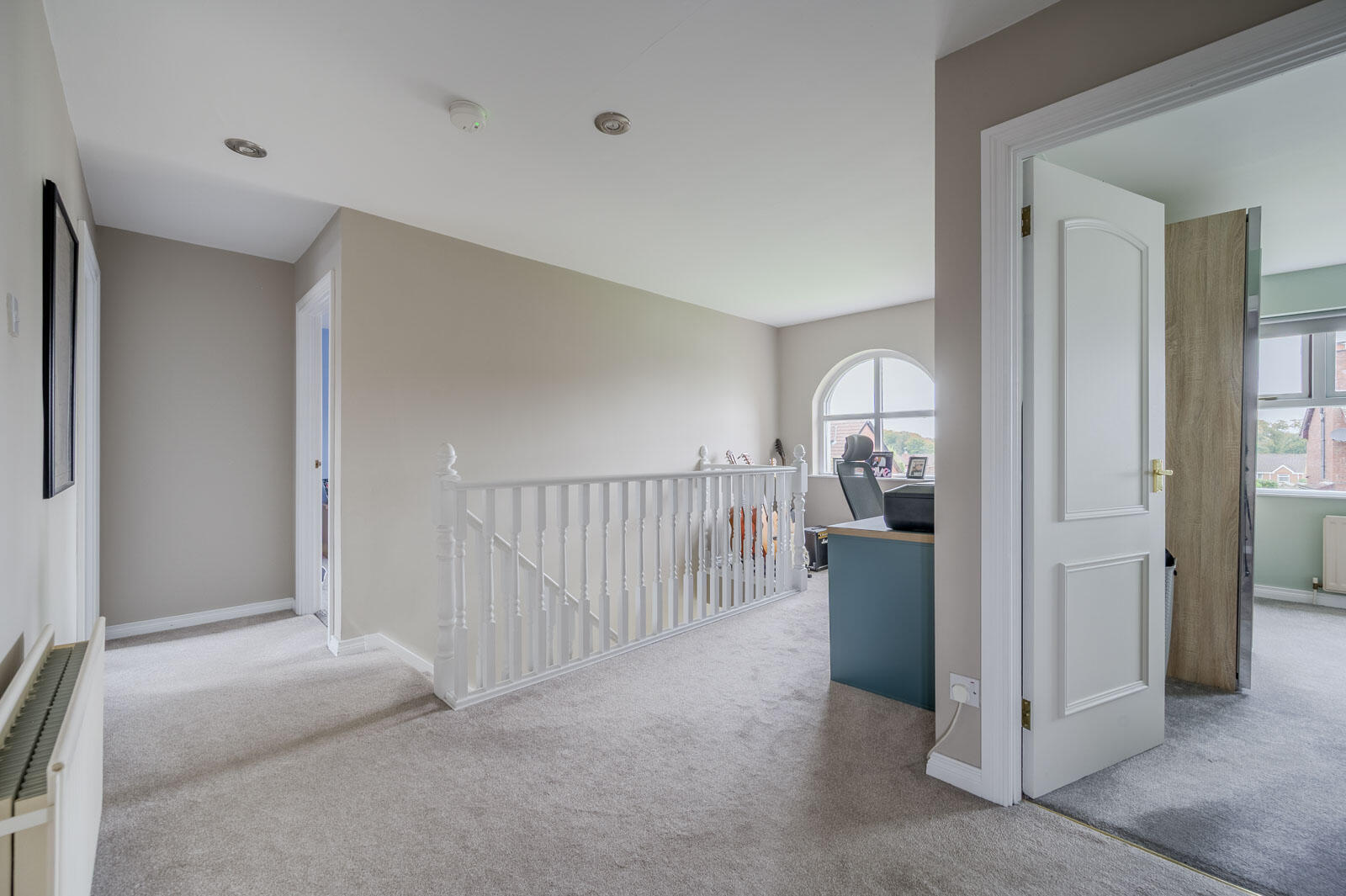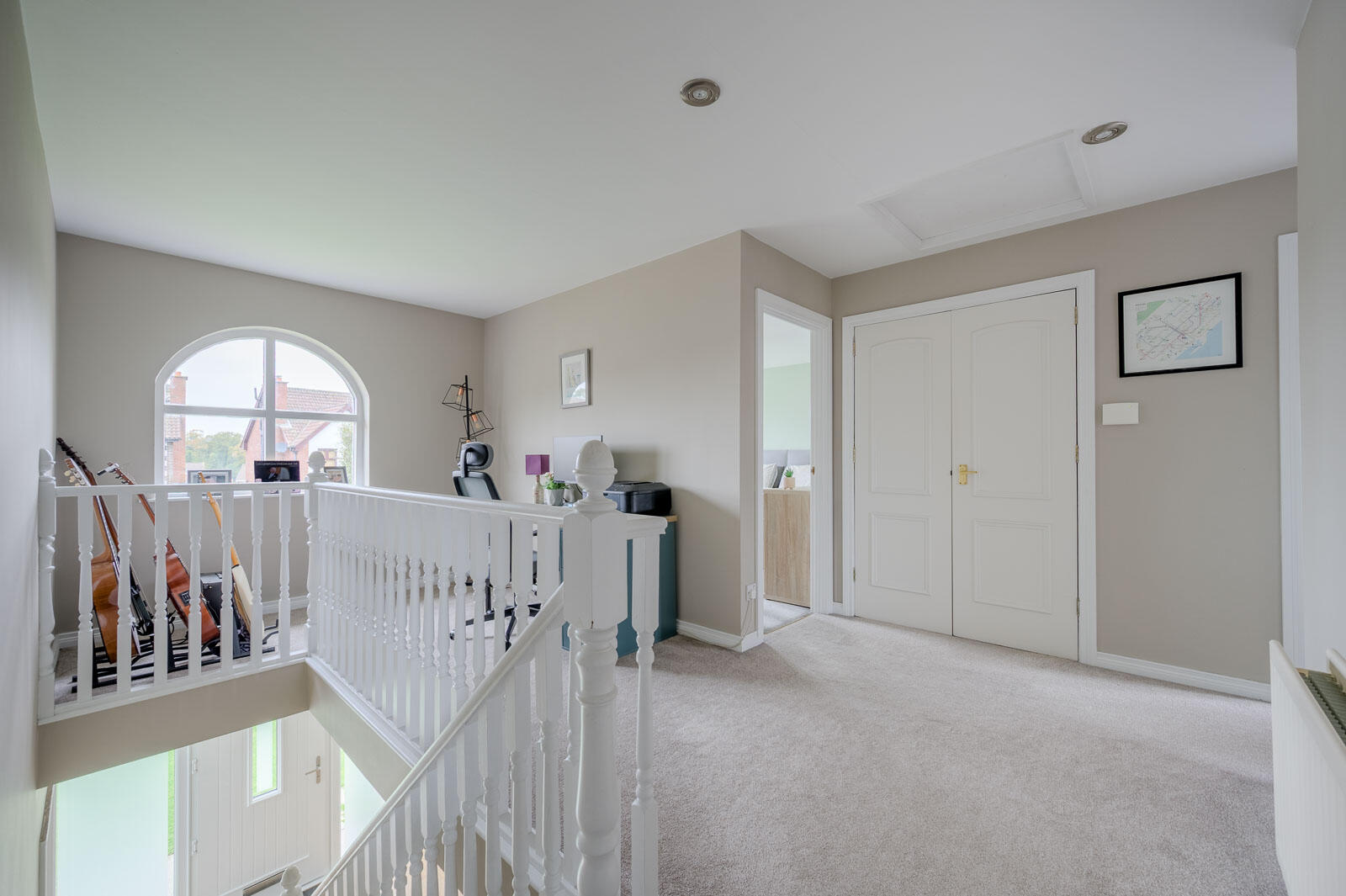 Spacious first floor landing with feature arched window and mature outlook to front and study or seating area, large linen press with double doors, lagged copper cylinder, built-in shelving, excellent storage, access hatch to roofspace.