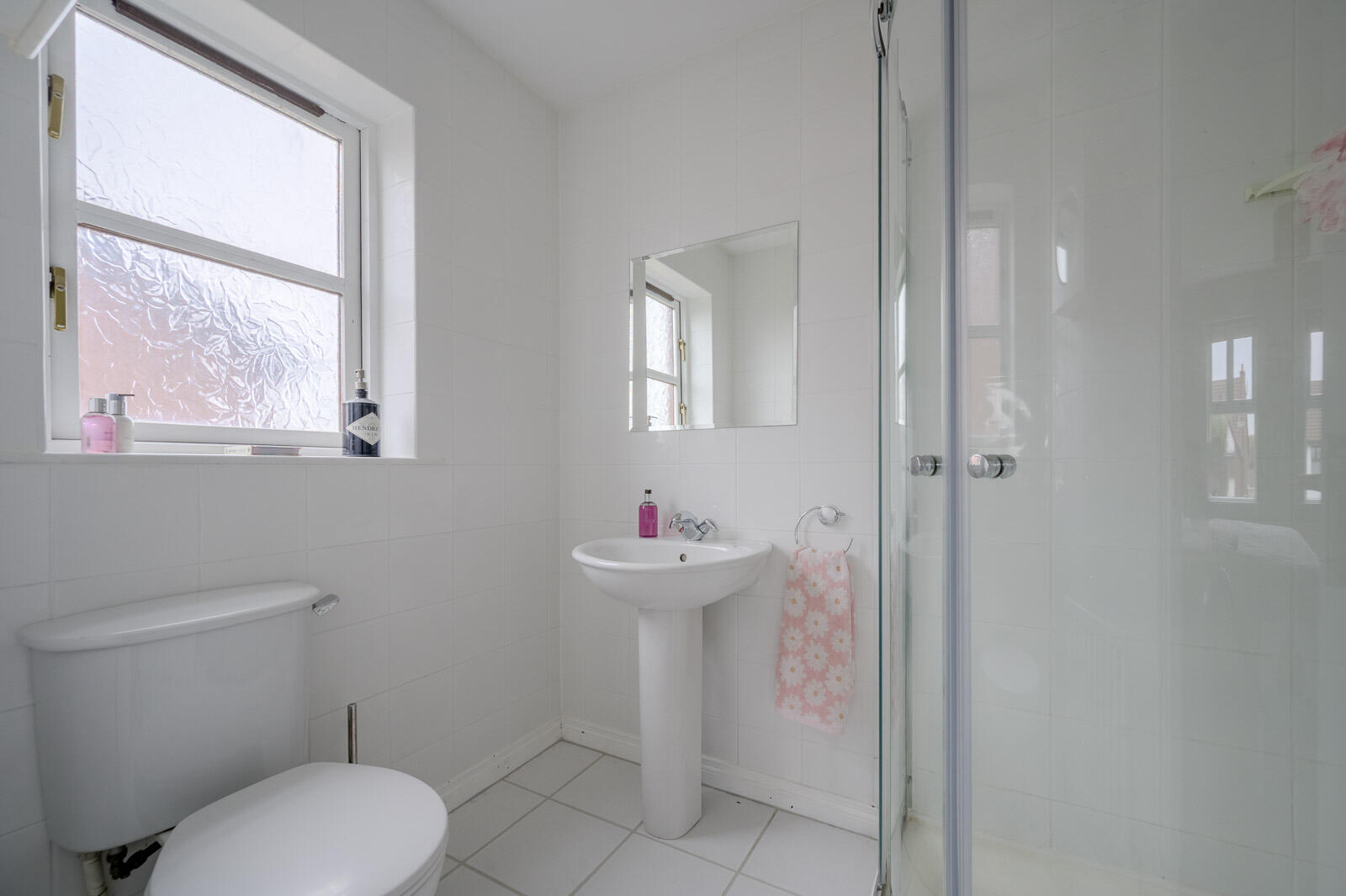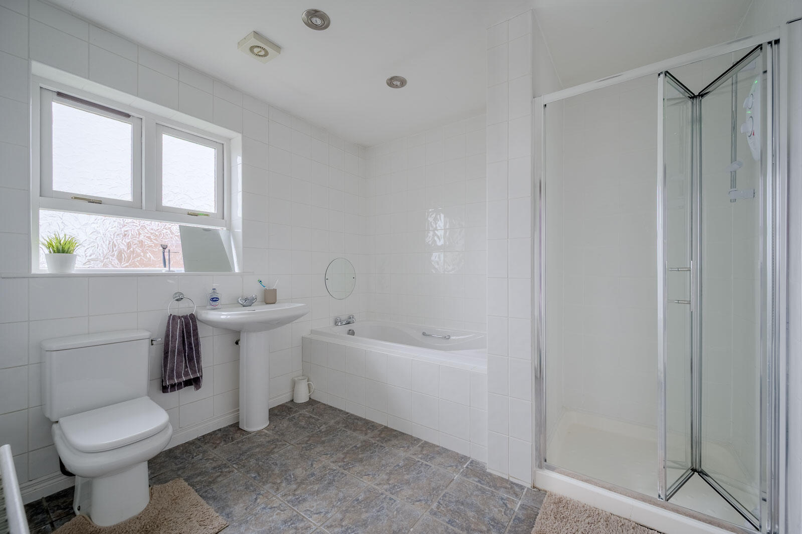 Ceramic tiled floor, white suite comprising low flush WC, pedestal wash hand basin, chrome mixer taps, fully tiled walls, recessed spotlighting.