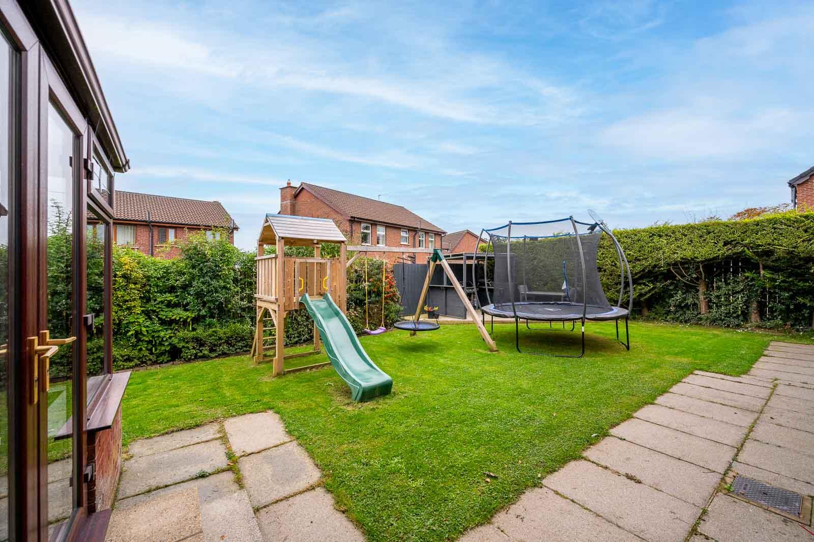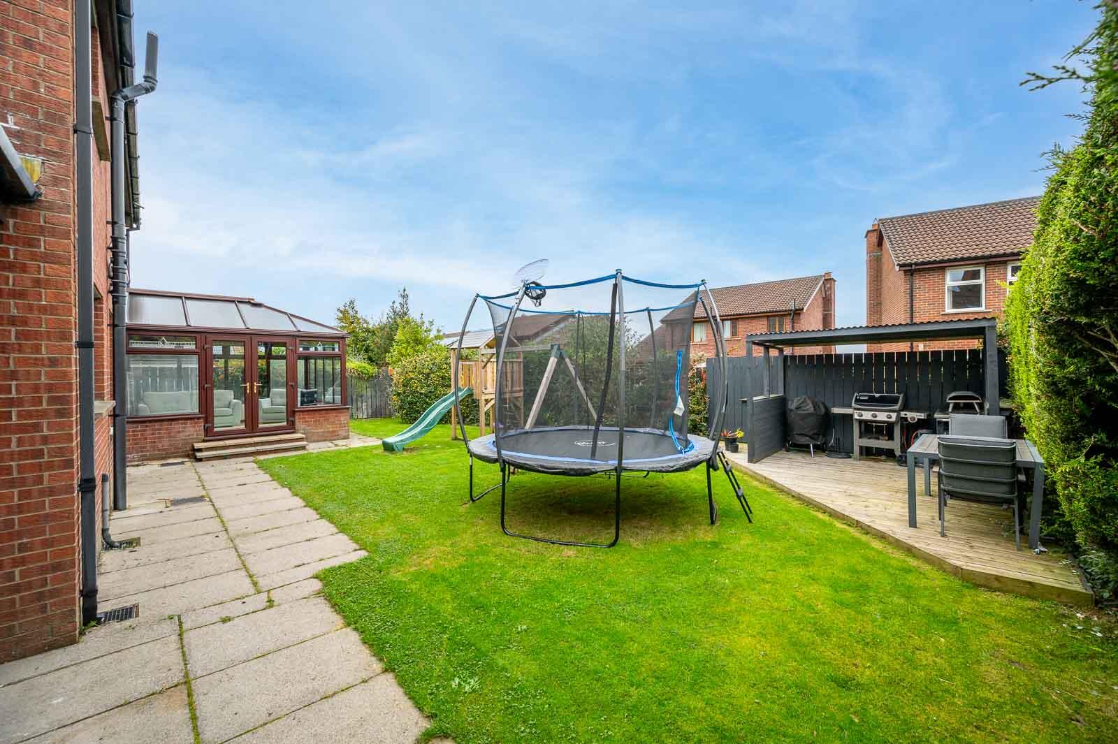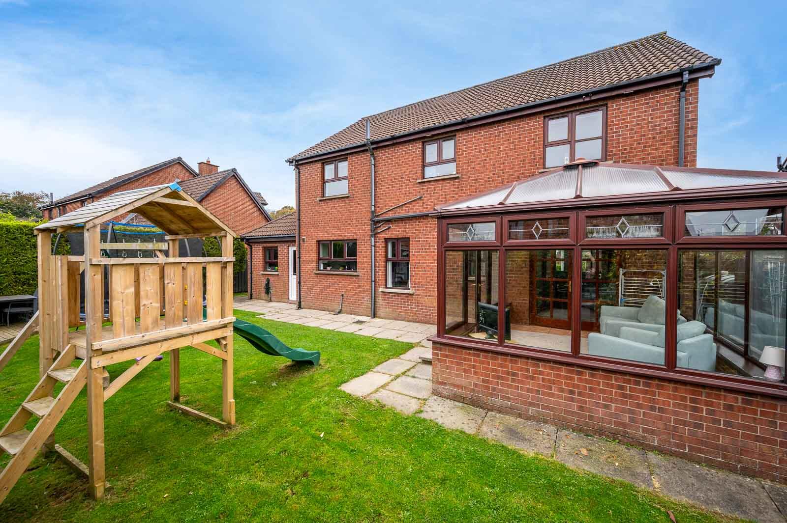 Generous enclosed rear garden laid in lawns with paved patio areas and pathways, barbecue area to corner of garden with timber decking, covered barbecue area ideal for outdoor entertaining or children at play, garden has southerly and easterly aspect, children´s Jungle Jim play equipment, mature planting, mature shrubs, bin and refuse area to side, outdoor light and tap, brick paviour driveway with ample parking leading to attached garage, outdoor light and power to front, mature front garden laid in lawns, mature shrubs, oil storage tank and oil fired boiler house to right hand side of property.