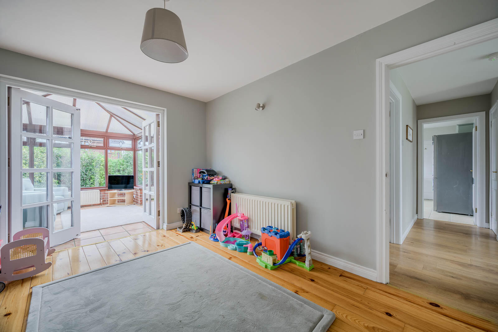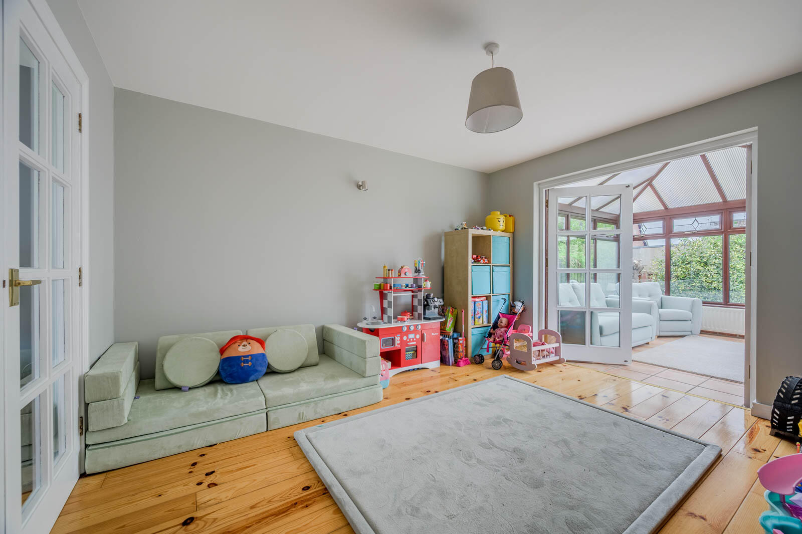 Currently used as playroom, with solid pitch pine wooden flooring, double glazed double doors to conservatory.