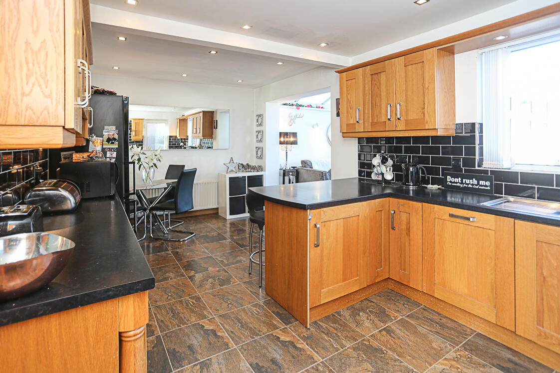 Kitchen with range of high and low level oak effect units. Laminate work surface. Single drainer sink and a half with mixer taps. Plumbed for washing machine, Integrated dishwasher. Integrated under bench fridge. Glazed display cabinets. Part tiled walls. Under double Hotpoint oven, four ring Hotpoint ceramic hob, stainless steel extractor above. Double glazed door to garden. Breakfast bar area. Tile effect floor and square arch leading through to sun room.