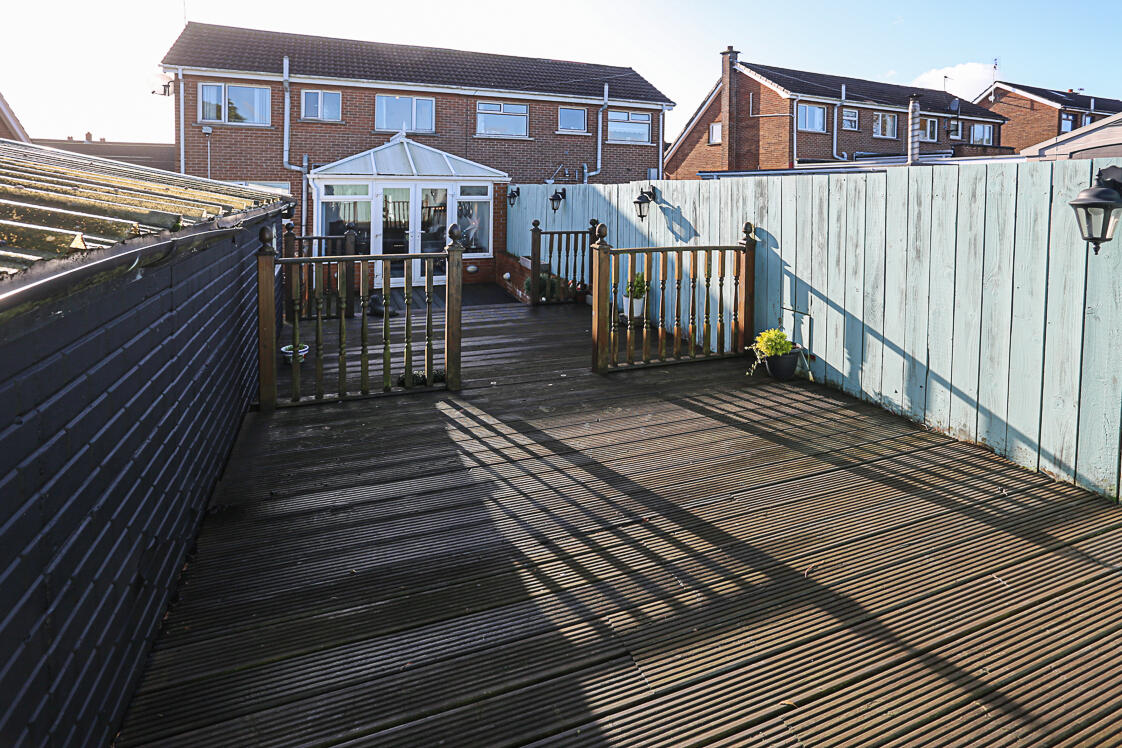Fully enclosed rear garden. Two-tiered decked area. Outside lighting. Outside tap. Outside light.