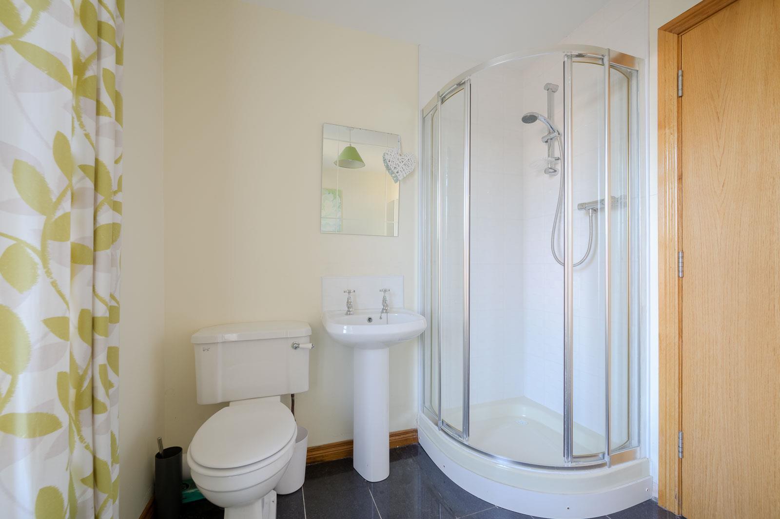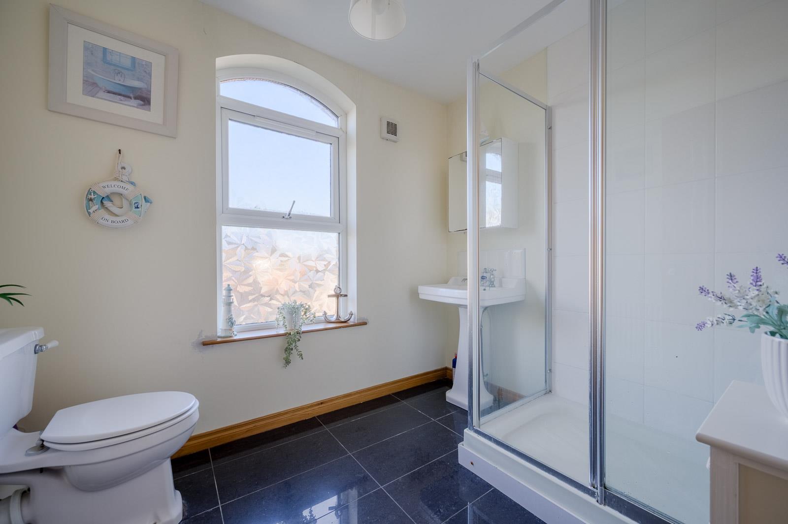 En Suite Shower Room : Three piece suite comprising built-in fully tiled shower cubicle, pedestal wash hand basin, low flush WC, fully tiled floor, extractor fan.