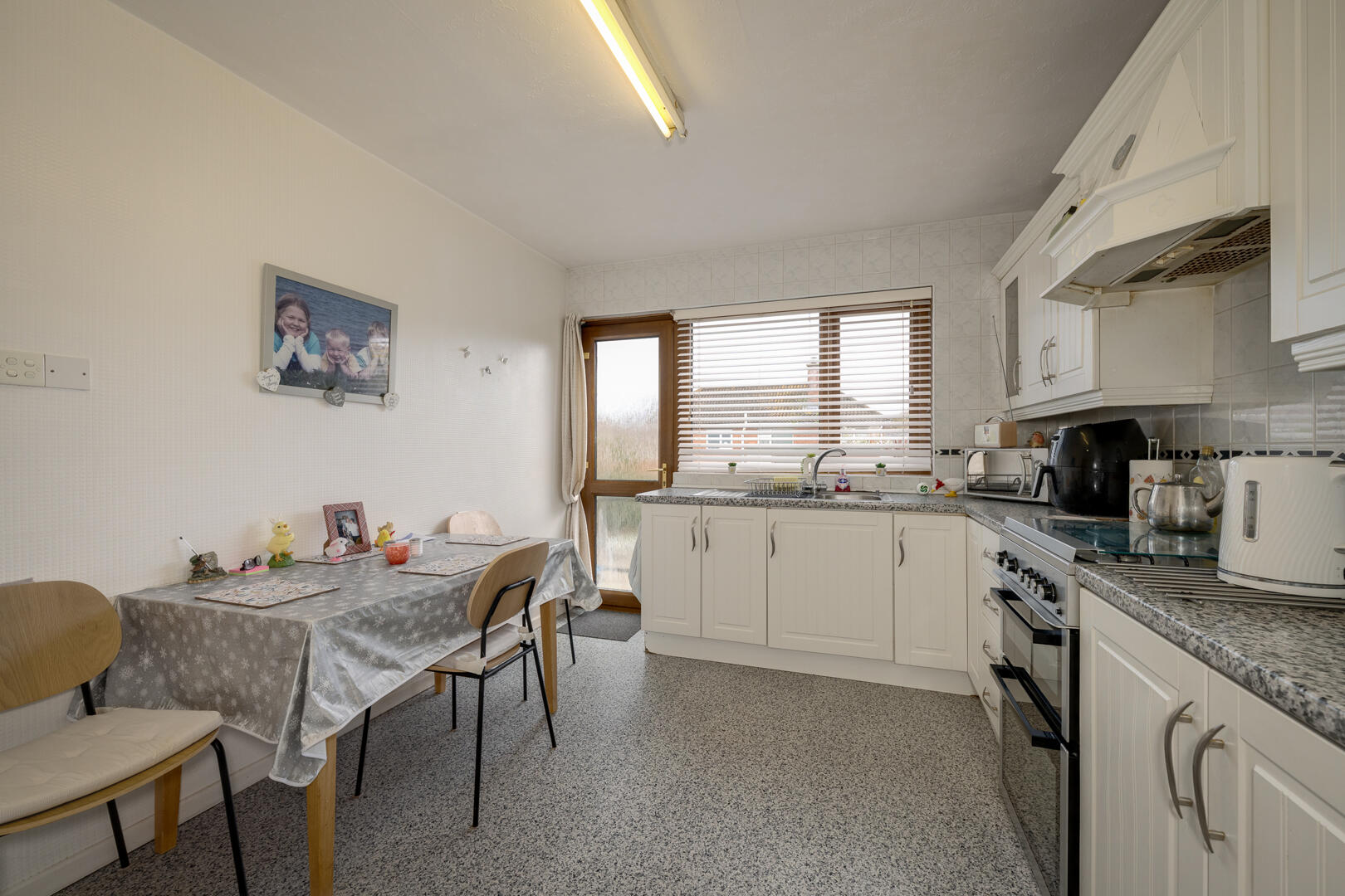 Fitted kitchen with dining area and garden access