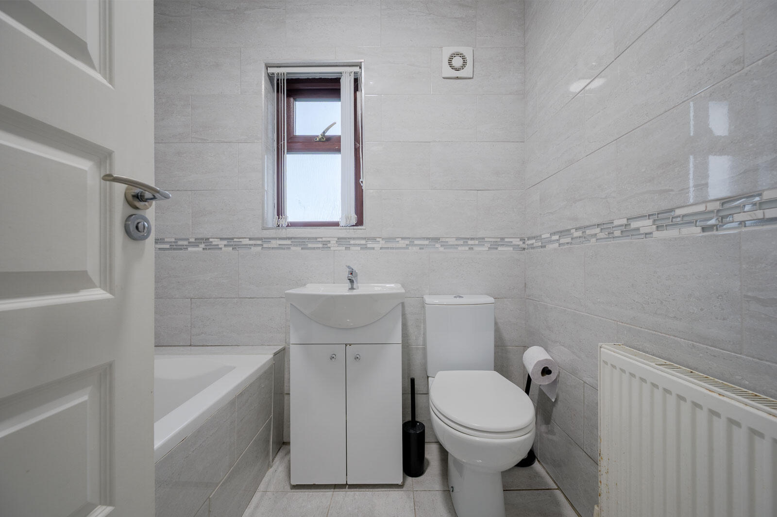 White suite comprising of low flush WC, pedestal wash hand basin, chrome mixer taps, vanity storage below, bath with mixer taps, thermostatically controlled shower, telephone handle attachment, tiled walls, glazed shower screen, tiled floor.