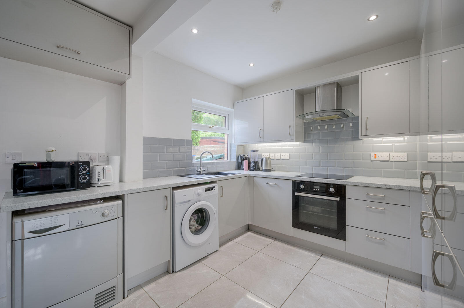 With tiled floor, kitchen with range of high and low level units, space for tumble dryer, space for washing machine, integrated dishwasher, integrated oven, four ring hob, stainless steel and glazed extractor fan, subway style tiling, integrated fridge, integrated freezer, laminate work surface, cupboard for electrics, inset spotlights.