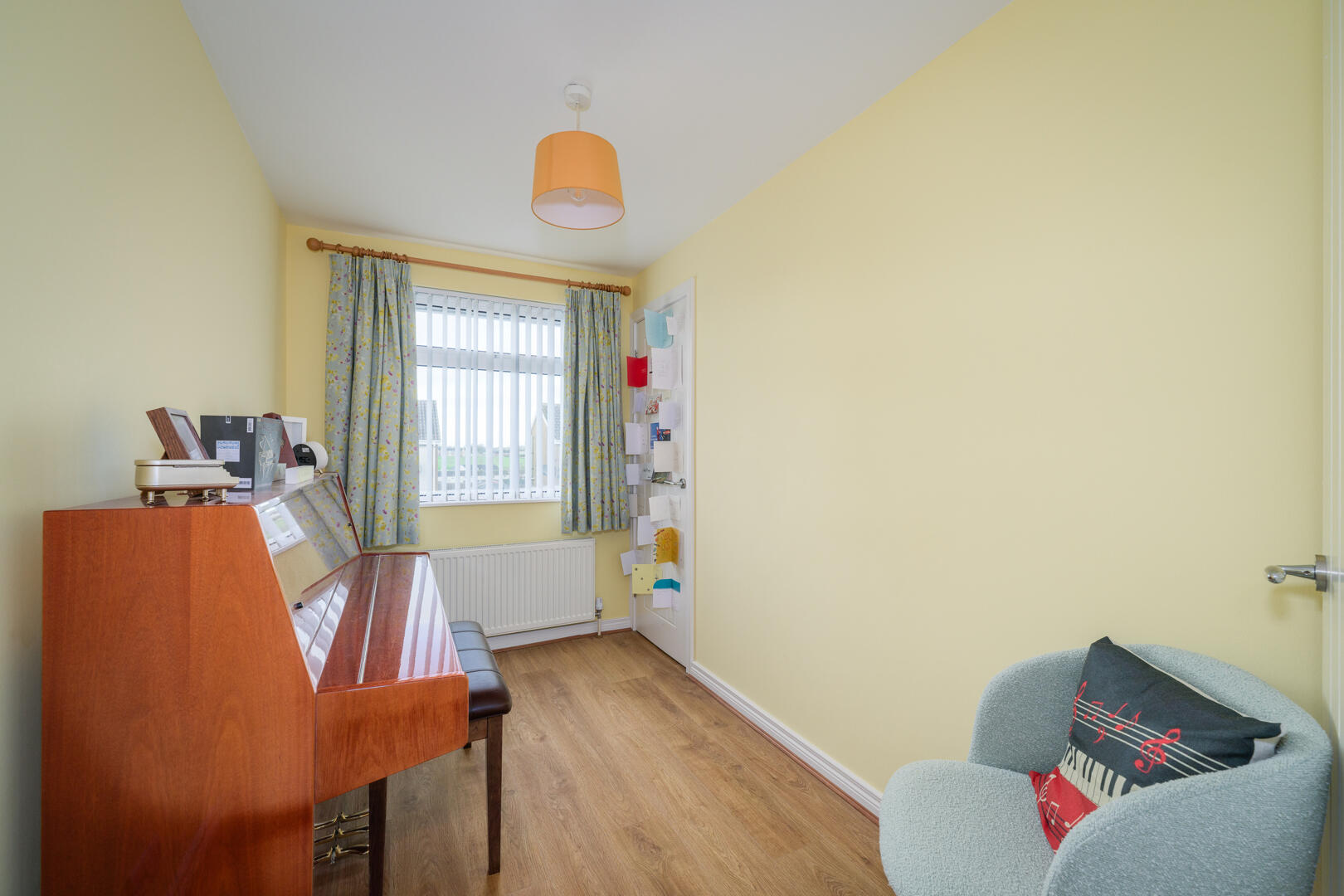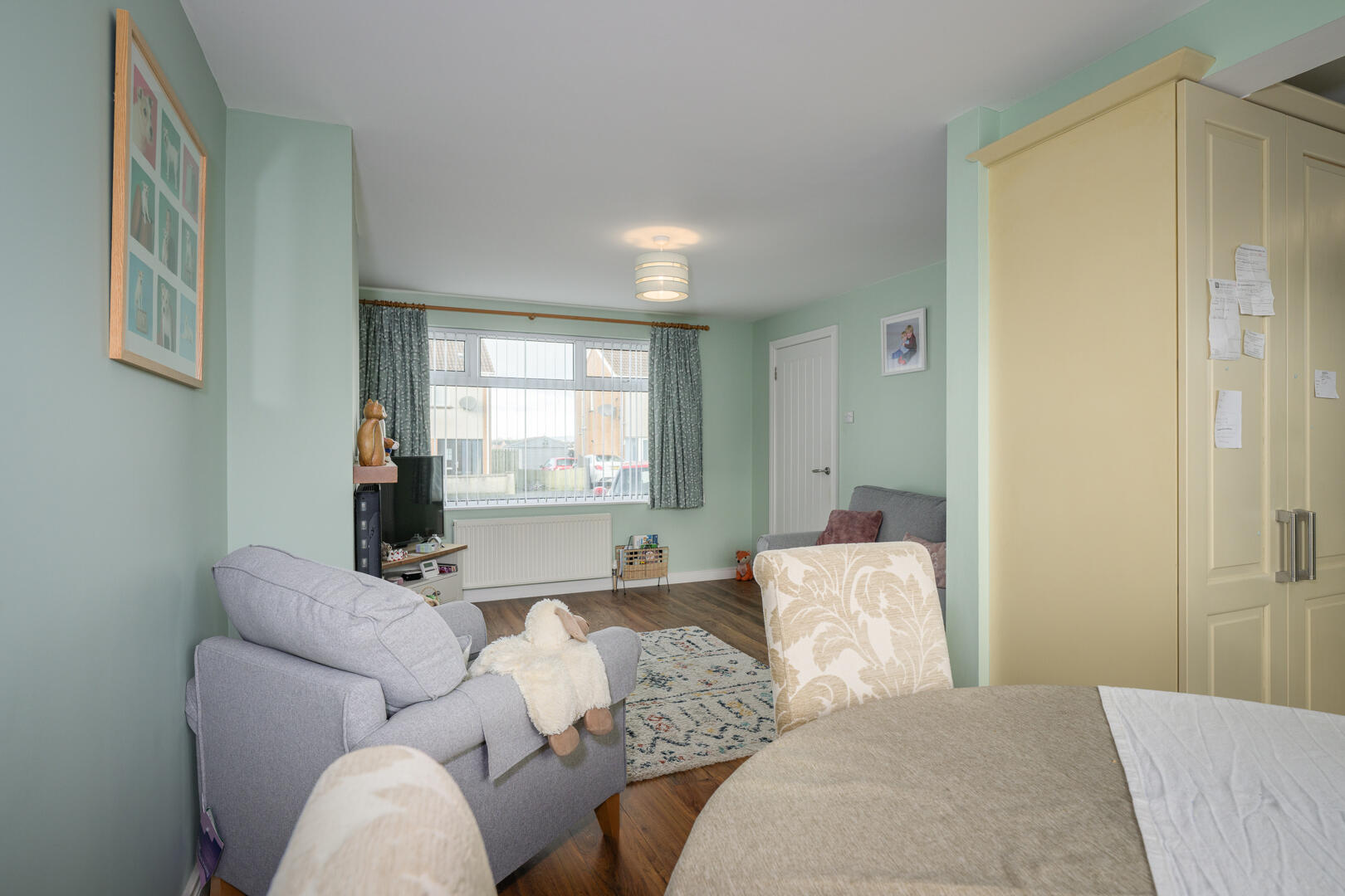 Outlook to front, laminate wood effect floor, open to dining room.