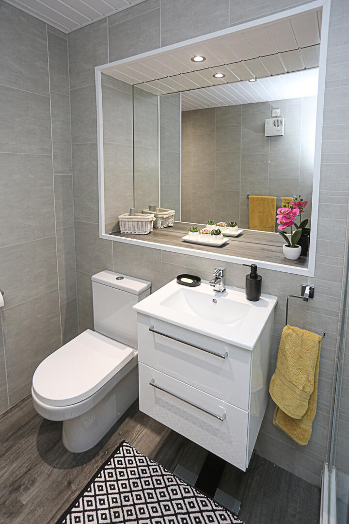 White suite comprising of low flush WC, wall hung wash hand basin, chrome mixer tap, vanity storage below, walk-in electric Mira Go Power shower, telephone handle attachment, glazed shower screen, uPVC panelled walls, laminate wood effect floor, uPVC tongue and groove ceiling, hotpress cupboard with shelving.