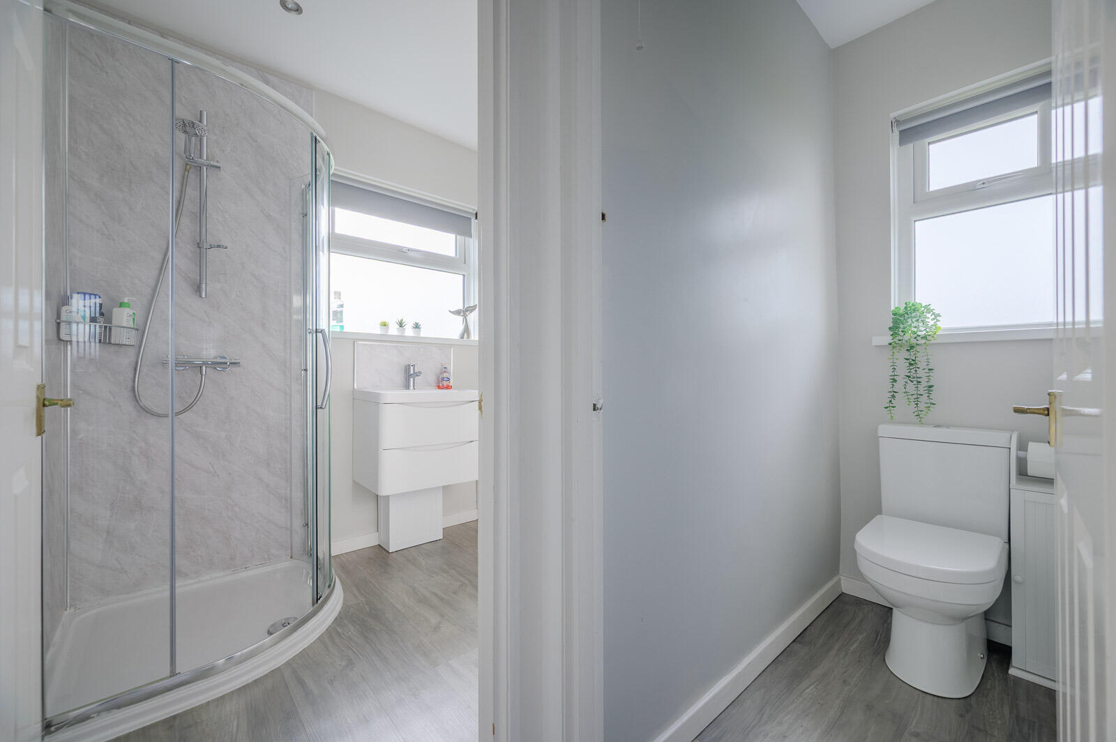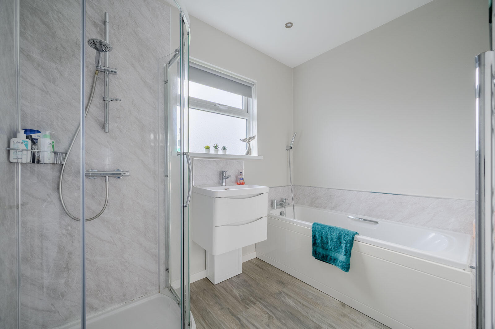 White suite comprising of wall hung wash hand basin, chrome mixer tap, vanity storage below, panelled bath with mixer taps, telephone handle attachment, walk-in thermostatically controlled shower, telephone handle attachment, uPVC panel, sliding glazed shower screen, laminate wood effect floor, chrome heated towel rail.