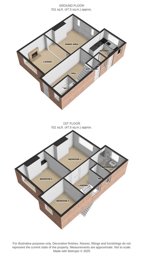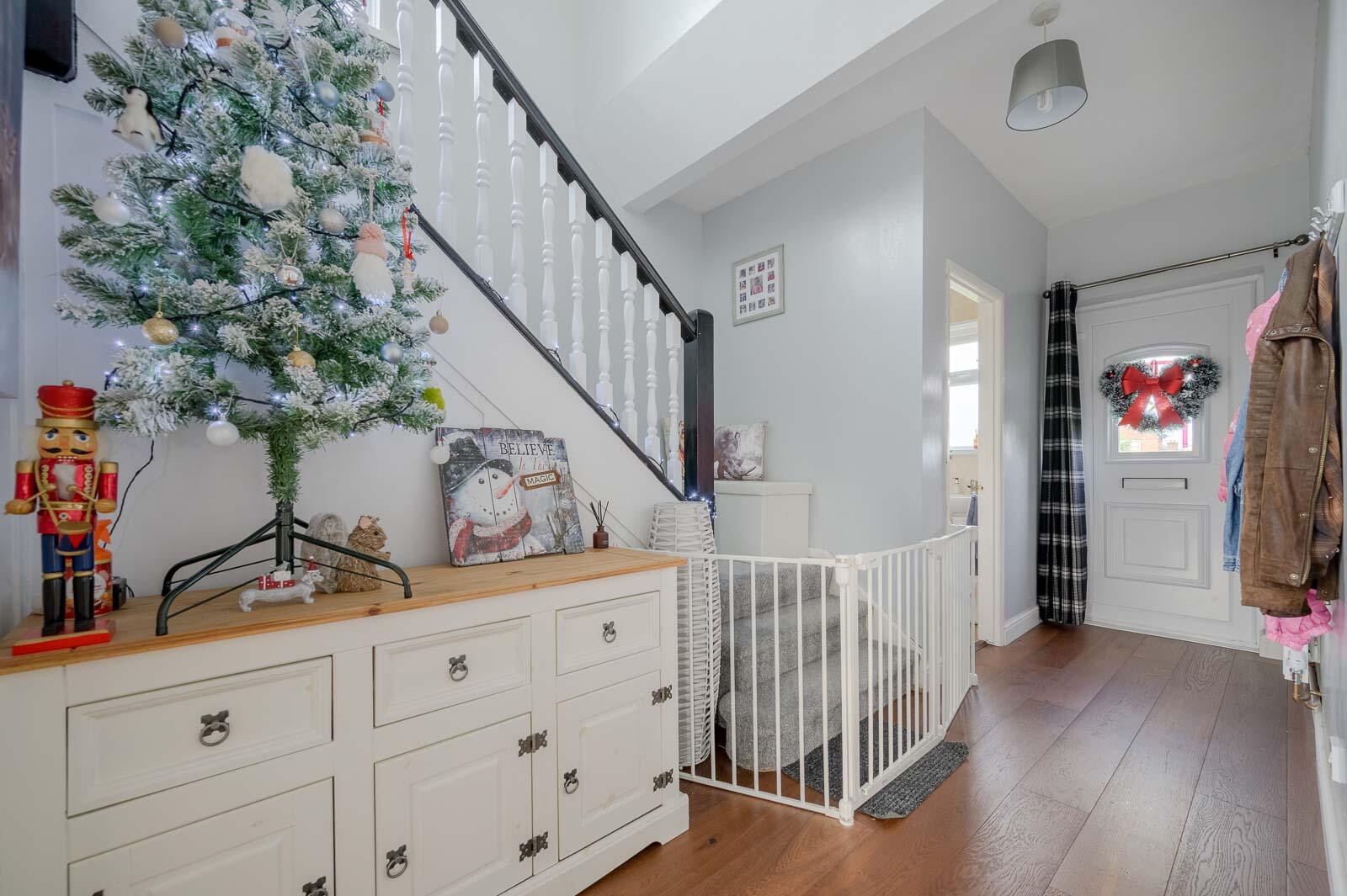 On the ground floor, the property features a welcoming reception hall leading to a spacious lounge that flows through to a dining area, creating an open and versatile living space perfect for everyday family life or entertaining. The modern kitchen is thoughtfully designed and provides access to the side garden, allowing for easy outdoor dining and recreation. A convenient downstairs WC completes the practical ground floor layout.