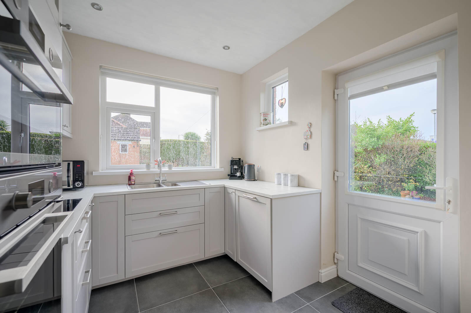 Range of high and low level units, integrated dual oven, four ring hob, laminate marble effect work surface, stainless steel sink and a half with chrome mixer taps, outlook to rear, integrated dishwasher, pantry cupboard, uPVC double glazed access door to side garden, space for fridge freezer, feature tiled floor.