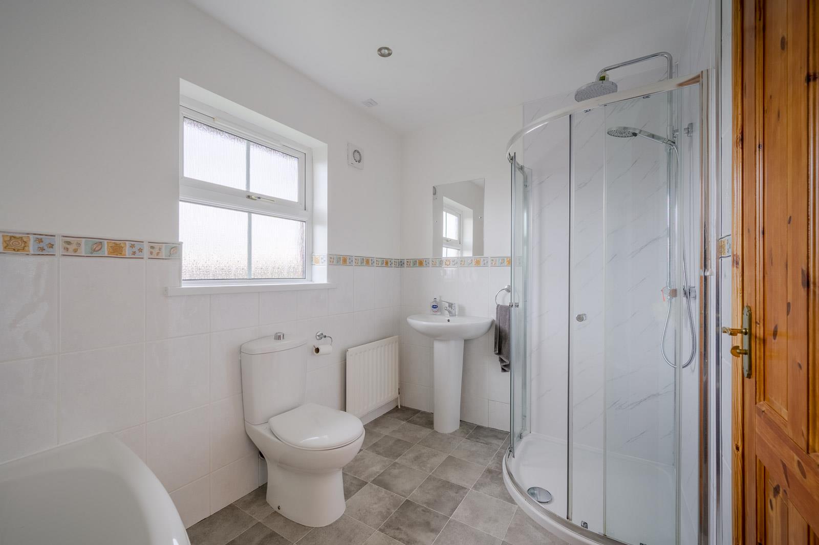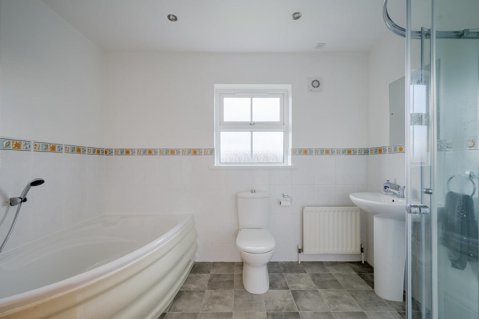 The family bathroom boasts a four-piece white suite, including a wall-hung hand basin, low-flush WC, separate built-in fully tiled corner shower and corner panelled bath.