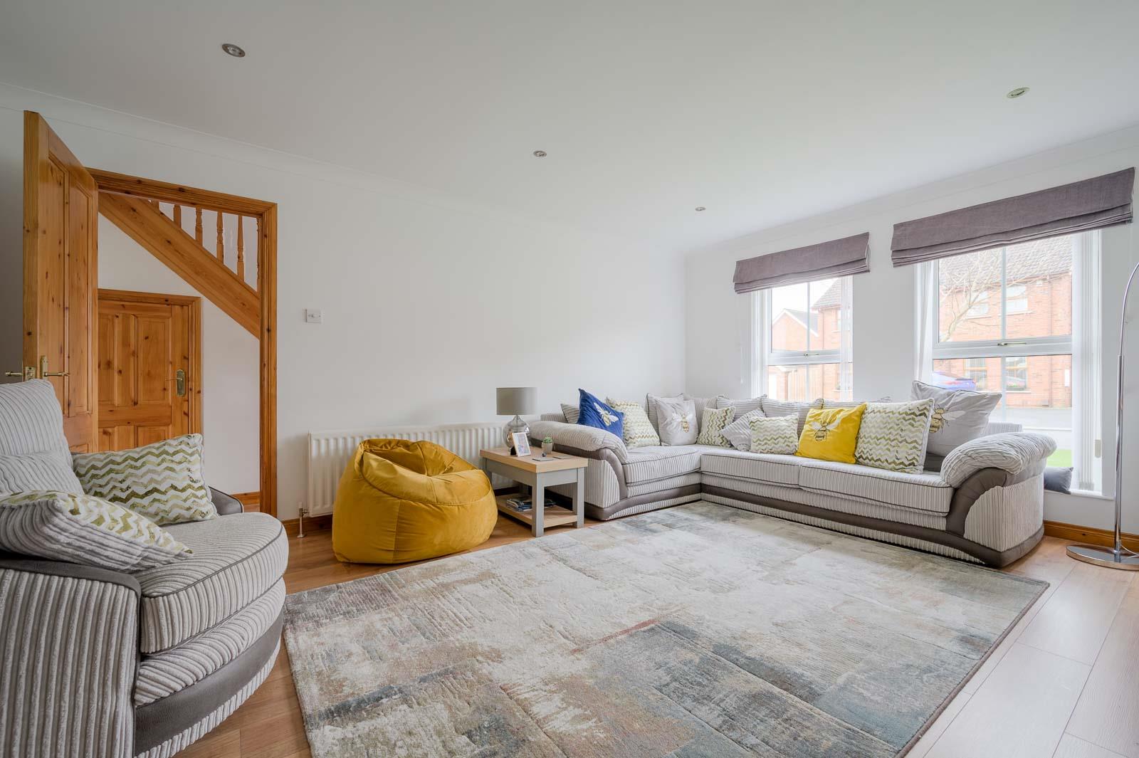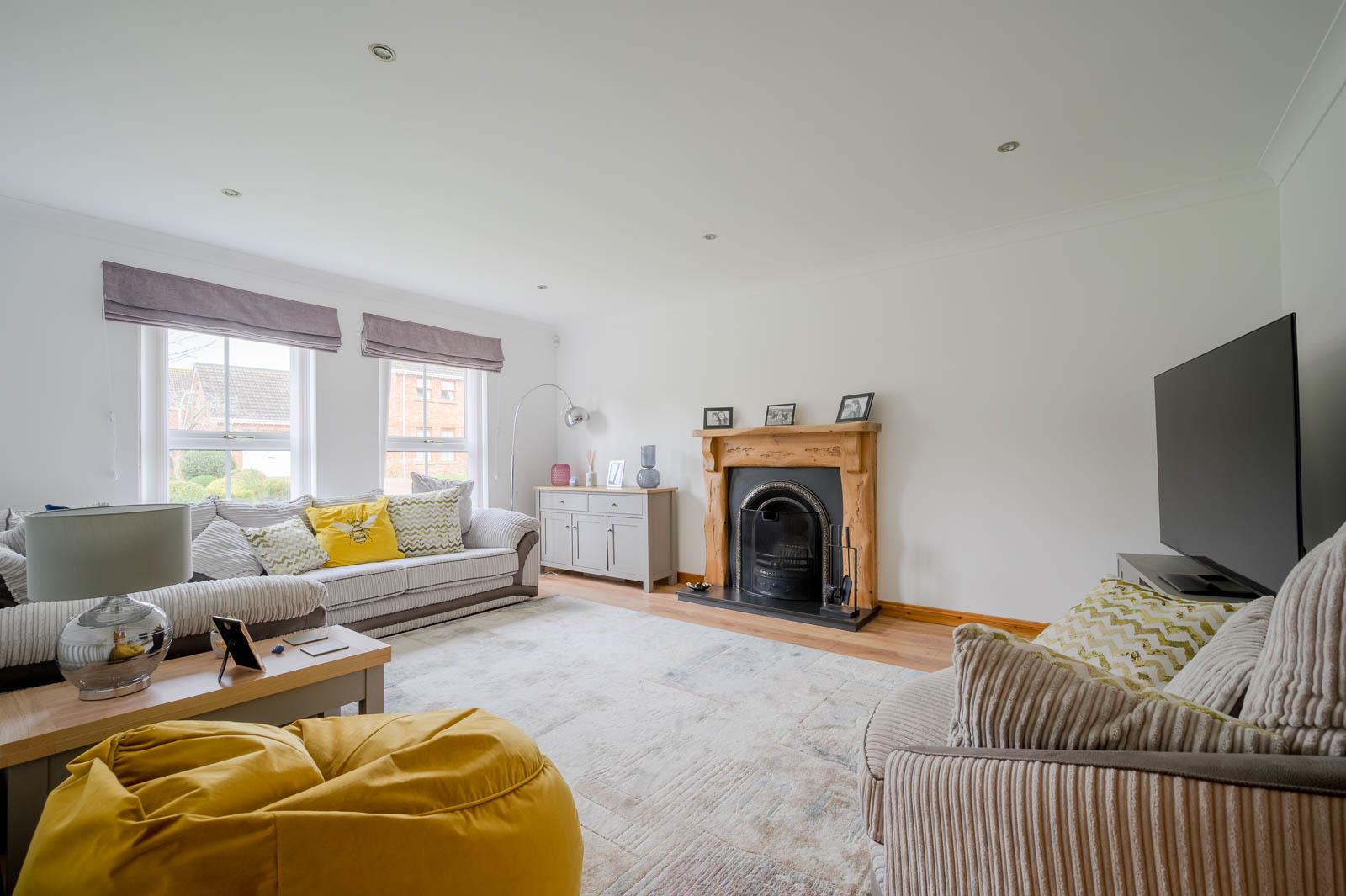 A generously proportioned and light-filled living room finished in a neutral palette and featuring large windows, laminate wood-effect flooring and a charming open fireplace, ideal for both relaxed family living and entertaining.
