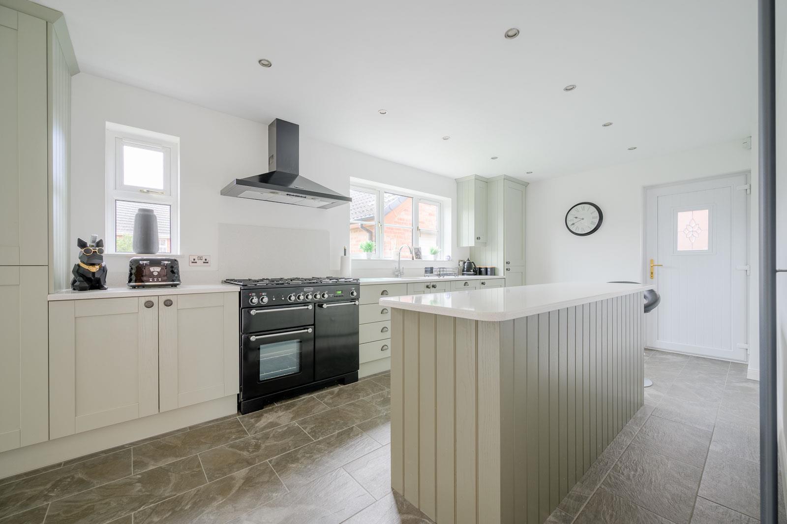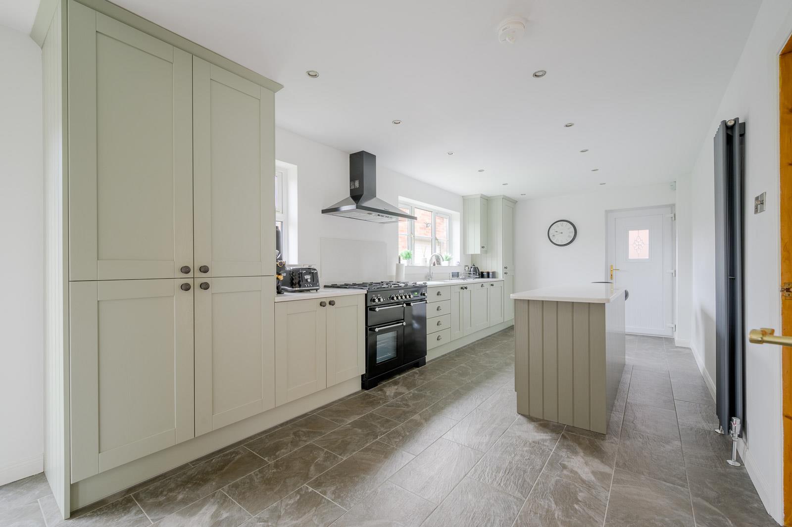 This stunning bespoke kitchen is fitted with a range of high and low-level shaker- style units, stainless steel fittings and stunning quartz countertops. The kitchen is equipped with a Rangemaster cooker, stainless-steel extractor hood and integrated fridge/freezer. A central island with quartz countertops provides both additional workspace and storage. The kitchen flows seamlessly into a spacious dining area with double patio doors leading to the rear garden. LED spotlighting illuminates the space.