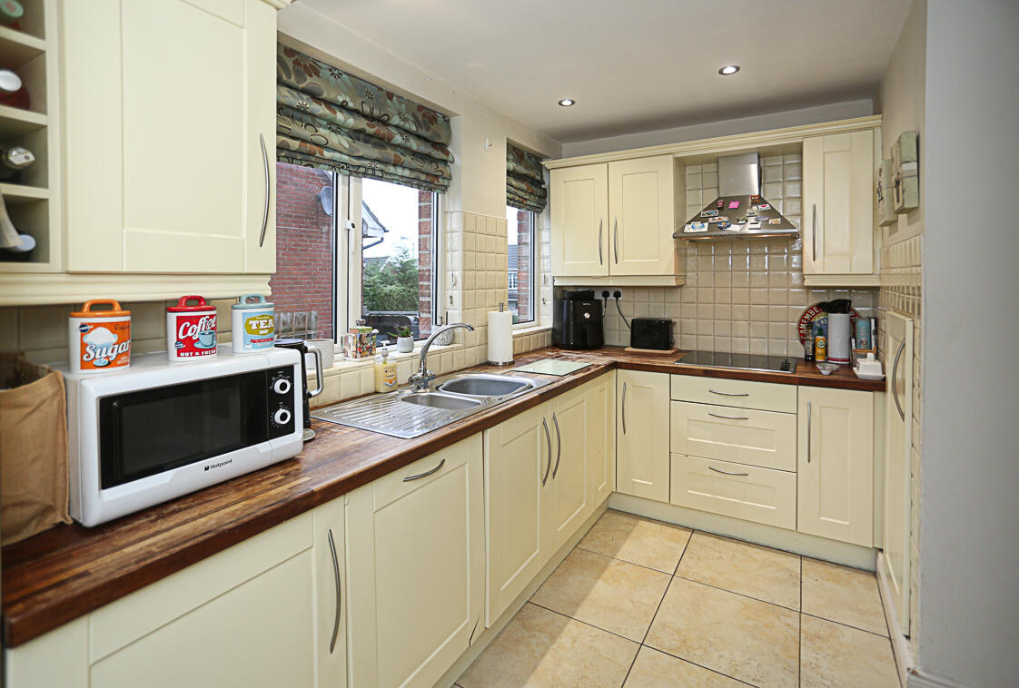 Range of high and low level units, integrated fridge, integrated freezer, dual oven, hardwood work surface, stainless steel sink and a half with drainer, chrome mixer taps, outlook to rear, partially tiled walls, four ring hob with stainless steel extractor above, uPVC and double glazed access door to rear garden, tiled floor, inset spotlights.