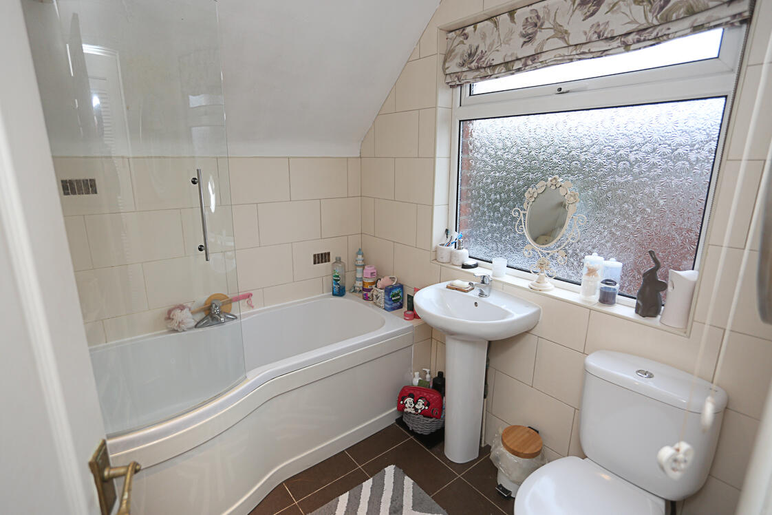 White suite comprising of low flush WC, pedestal wash hand basin, chrome mixer taps, P-shaped panelled bath with mixer taps, electric Mira Sport shower, telephone handle attachment, tiled walls, tiled floor.