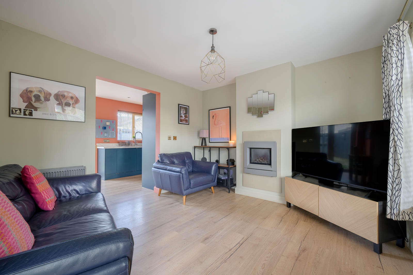 With outlook to front, laminate wood effect floor, central gas coal effect fire, square arch leading through to kitchen/dining.
