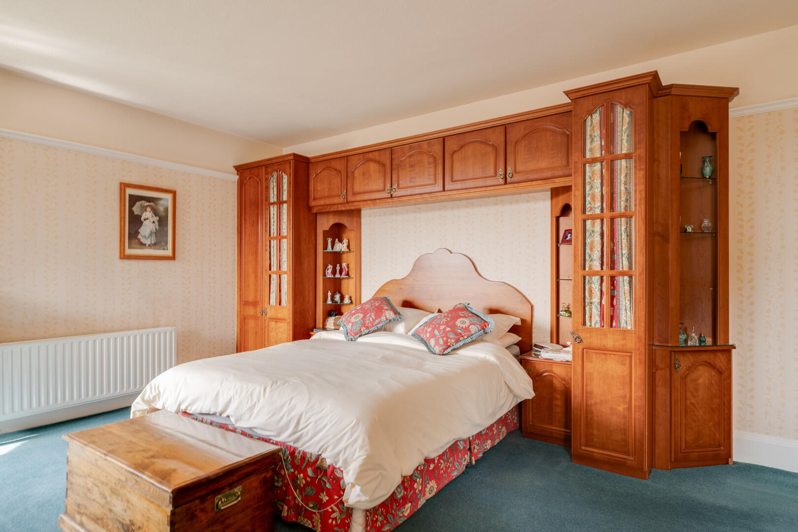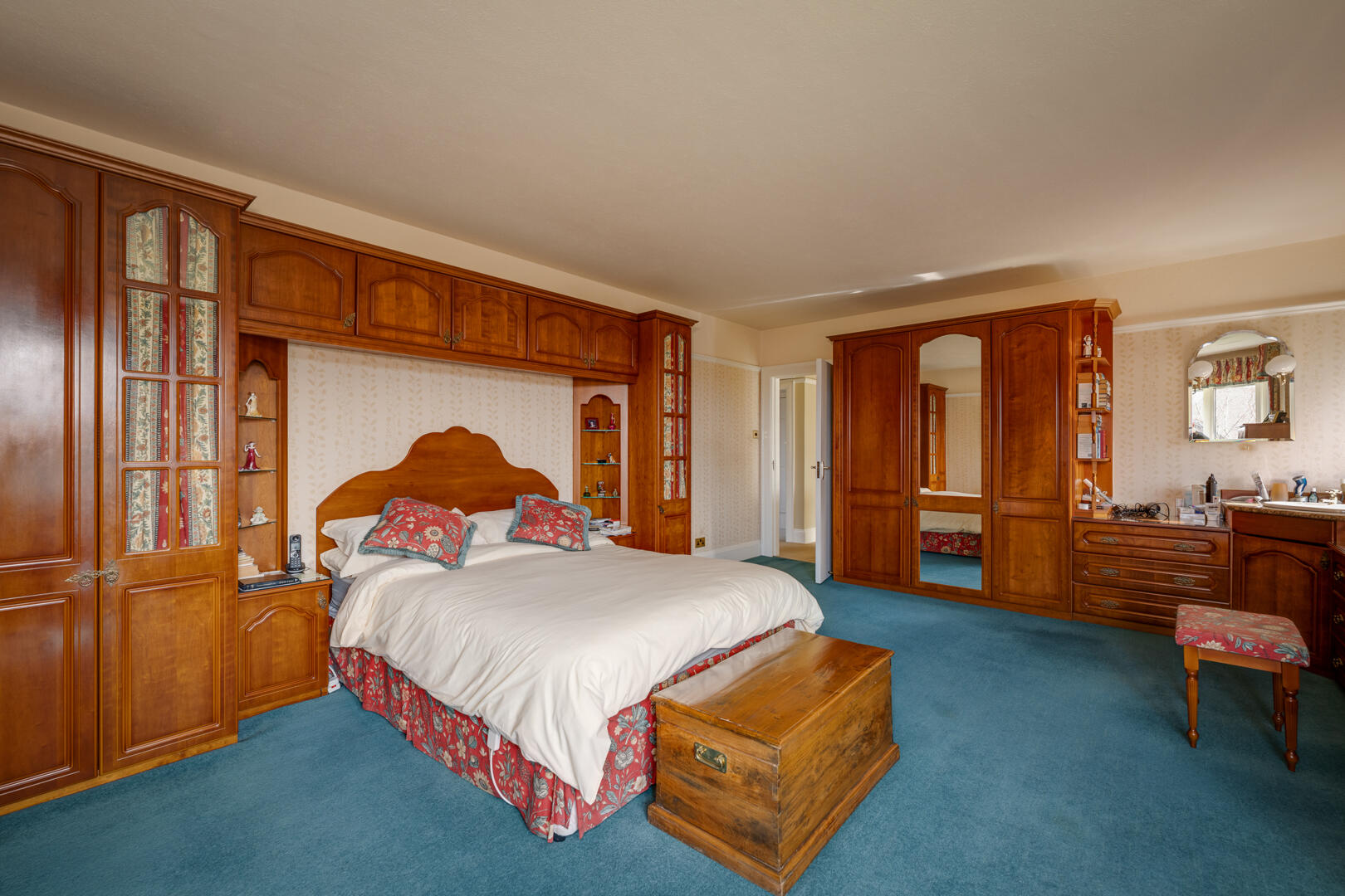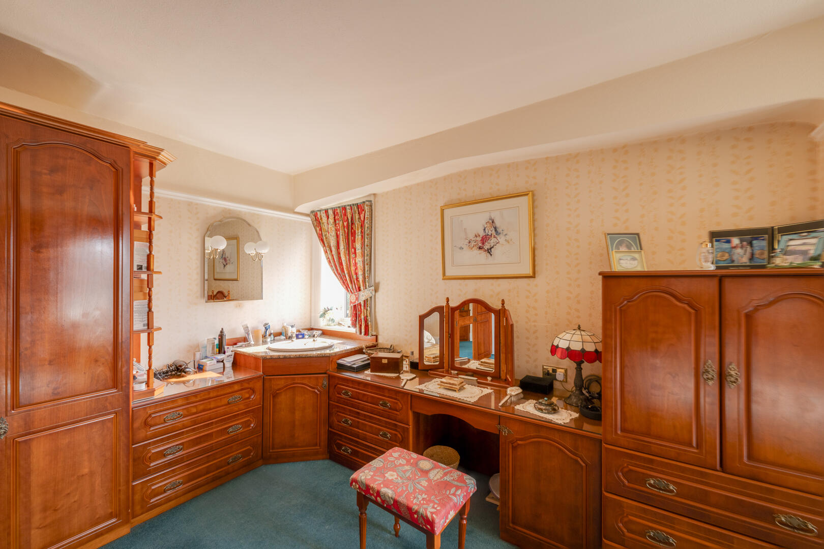 With square bay corner window, delightful outlook across mature gardens and across Bangor West with glimpses of Belfast Lough and views to the Antrim Hills, extensive range of built-in bedroom furniture including range of built-in robes, drawer units, vanity unit with basin inset in granite, dressing table, double bed recess, bedside cabinets, display areas, cupboards above, additional wardrobe space.