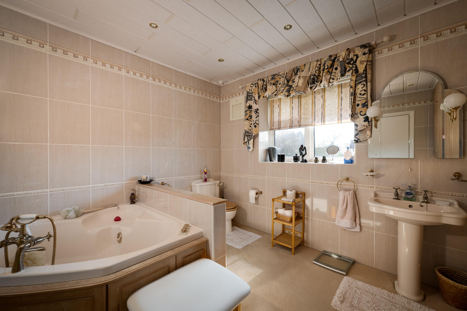 Luxurious light coloured bathroom suite comprising low flush WC, bidet, pedestal wash hand basin, panelled corner Jacuzzi bath, mixer taps and telephone hand shower, heated towel rail, fully tiled walls, PVC ceiling with recessed spotlighting, wall to wall range of built-in robes and storage to include linen press with copper cylinder, mature outlook to gardens, access to roofspace.