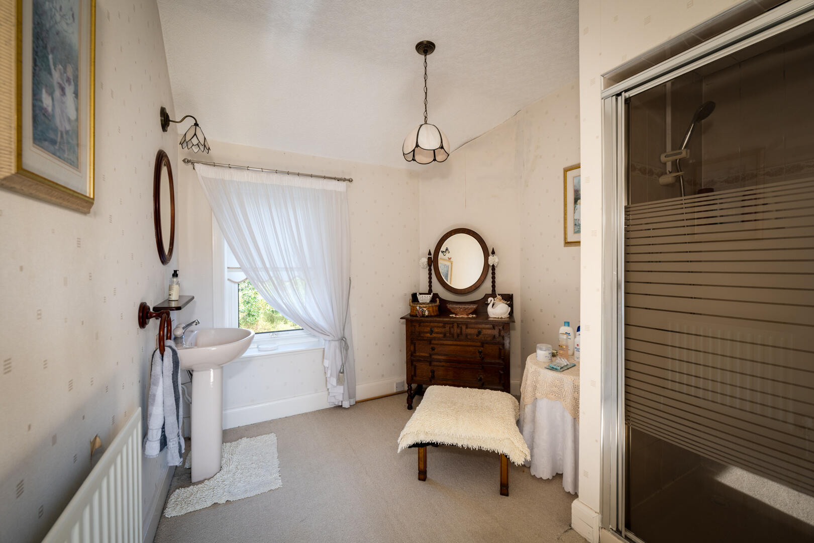 Separate shower room with built-in fully tiled shower cubicle, thermostatically controlled shower unit, pedestal wash hand basin, outlook to driveway and Maxwell Park.