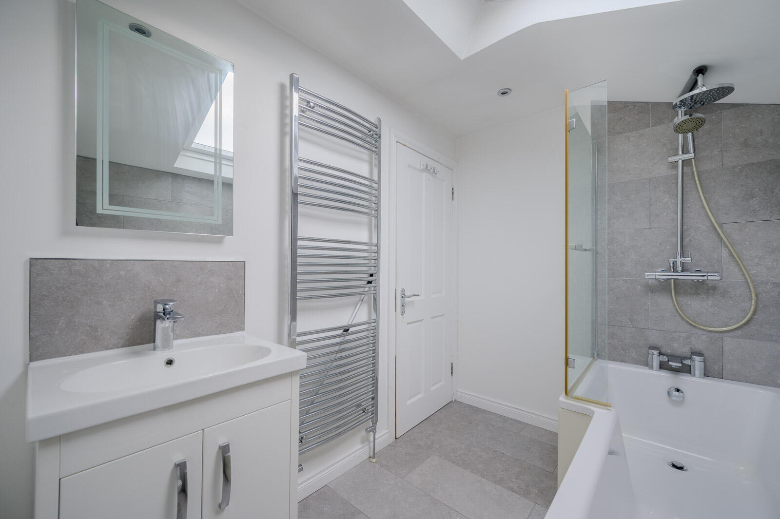 Three piece suite comprising panelled bath with mixer tap and shower over, wash hand basin, mixer tap, tiled splashback, storage beneath, low flush WC, chrome heated towel rail, fully tiled floor, part tiled walls.