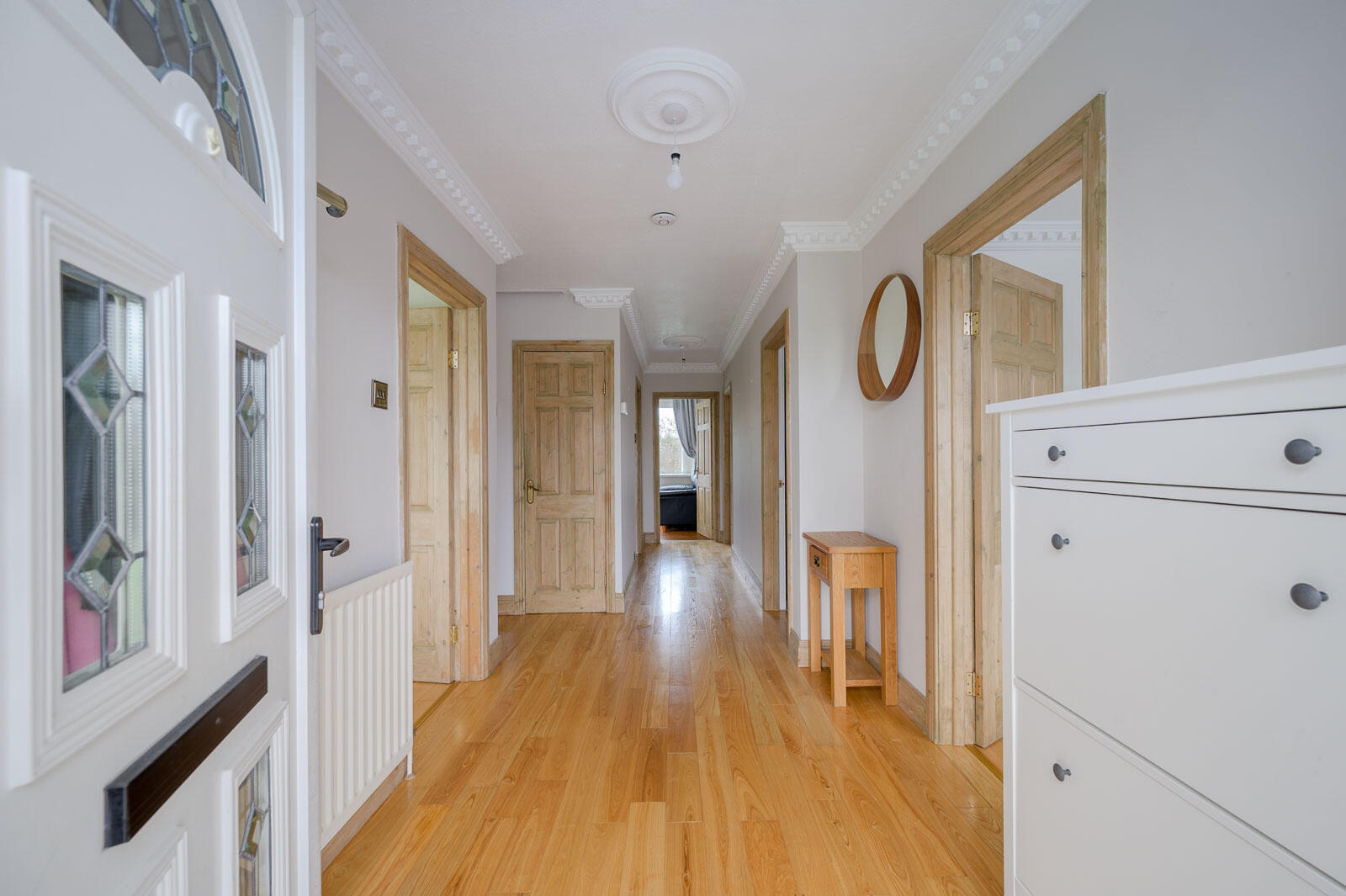 Cornice ceiling, solid wooden floor, storage under stairs, ceiling roses.