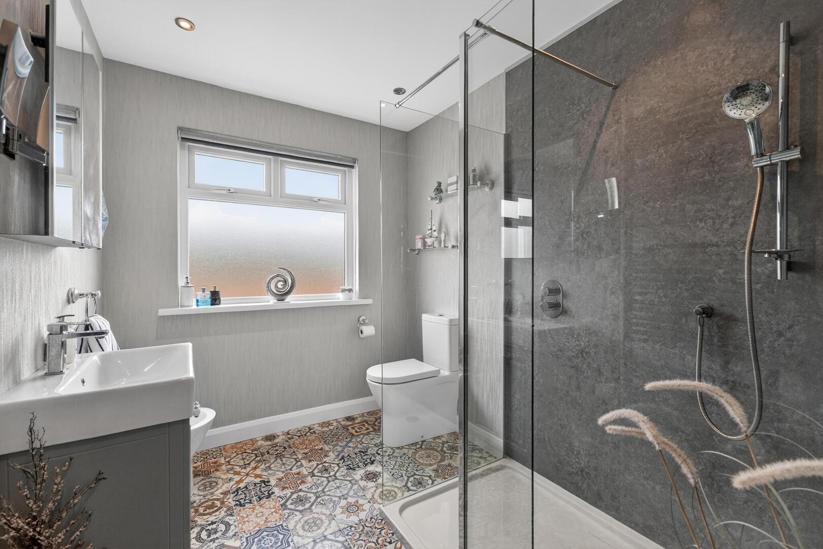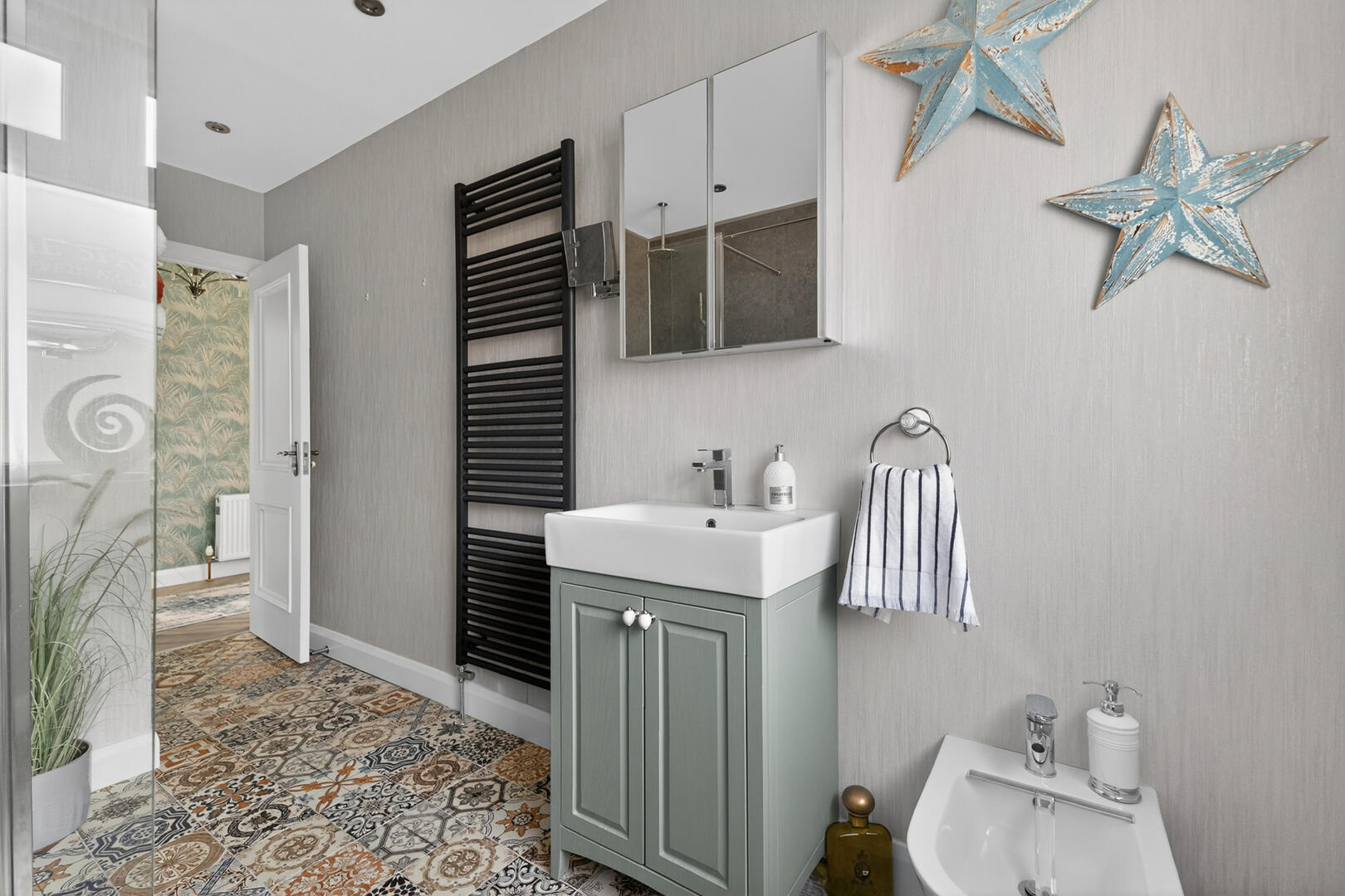 Four piece suite comprising shower cubicle, low flush WC, wash hand basin with mixer taps, storage beneath, bidet, fully tiled floor, heated towel rail, extractor fan