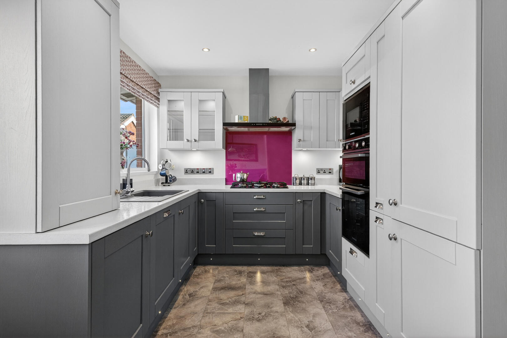 Range of high and low level units, granite effect work surfaces, single bowl single drainer sink unit with mixer tap, integrated five ring gas hob, tiled splashback, extractor fan above, integrated double oven, integrated microwave, integrated dishwasher, integrated washing machine, gas fired boiler, glass display cabinets with built-in lighting, built-in quartz table and seating, laminate tile effect floor, uPVC double glazed door to rear garden.