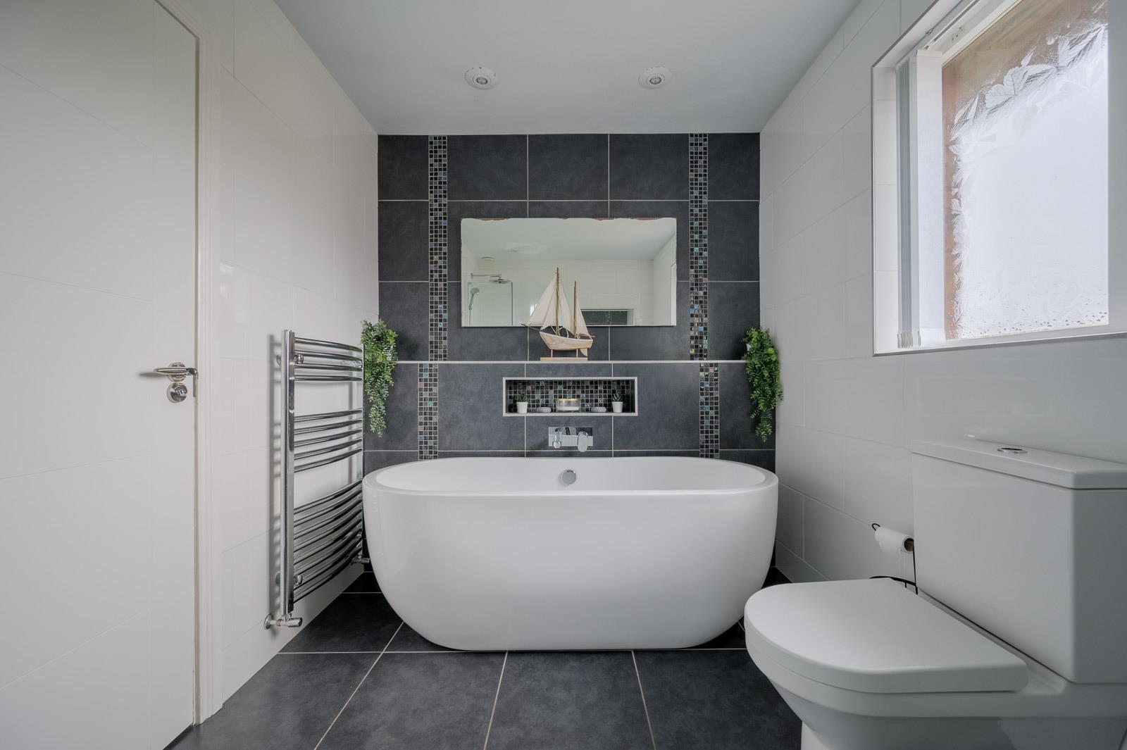 With modern white suite comprising low flush WC, twin ceramic sink unit, chrome mixer taps, mirror above, cabinets below, double built-in fully tiled shower cubicle with chrome thermostatically controlled shower unit, overhead rain shower and recessed spotlighting, chrome heated towel rail, Velux window, fully tiled walls with contrasting tiling detail, porcelain tiled floor.