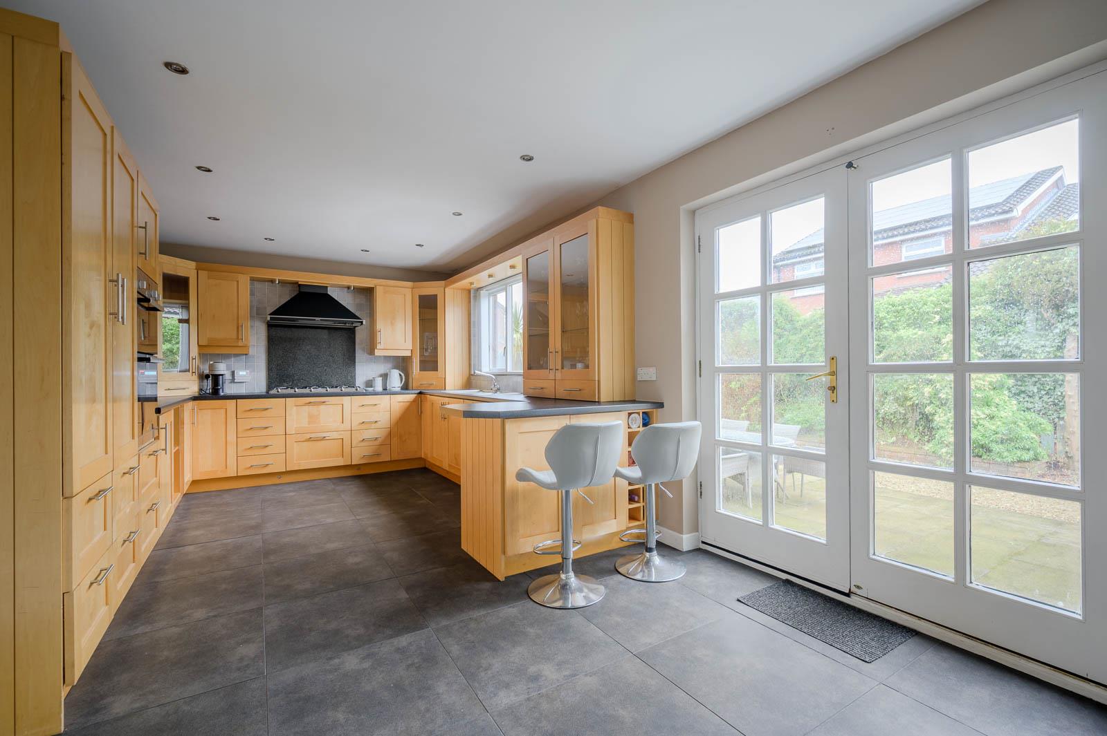 With ceramic tiled floor, kitchen opens through square arch to dining and sun room, bespoke fitted maple Shaker kitchen, stainless steel fittings, granite effect work surface, integrated stainless steel Smeg five ring gas hob, granite splashback, extractor hood above, built-in glazed display cabinets, integrated stainless steel microwave, integrated stainless steel high level double ovens, built-in pantry, pull-out drawers, integrated dishwasher, stainless steel sink and a half sink unit, mature outlook to south facing rear garden, peninsula unit with built-in casual dining, open space for dining or living with double glazed French doors opening to rear patio and south facing rear garden, open through square arch to dining space and open to garden room/sun room.