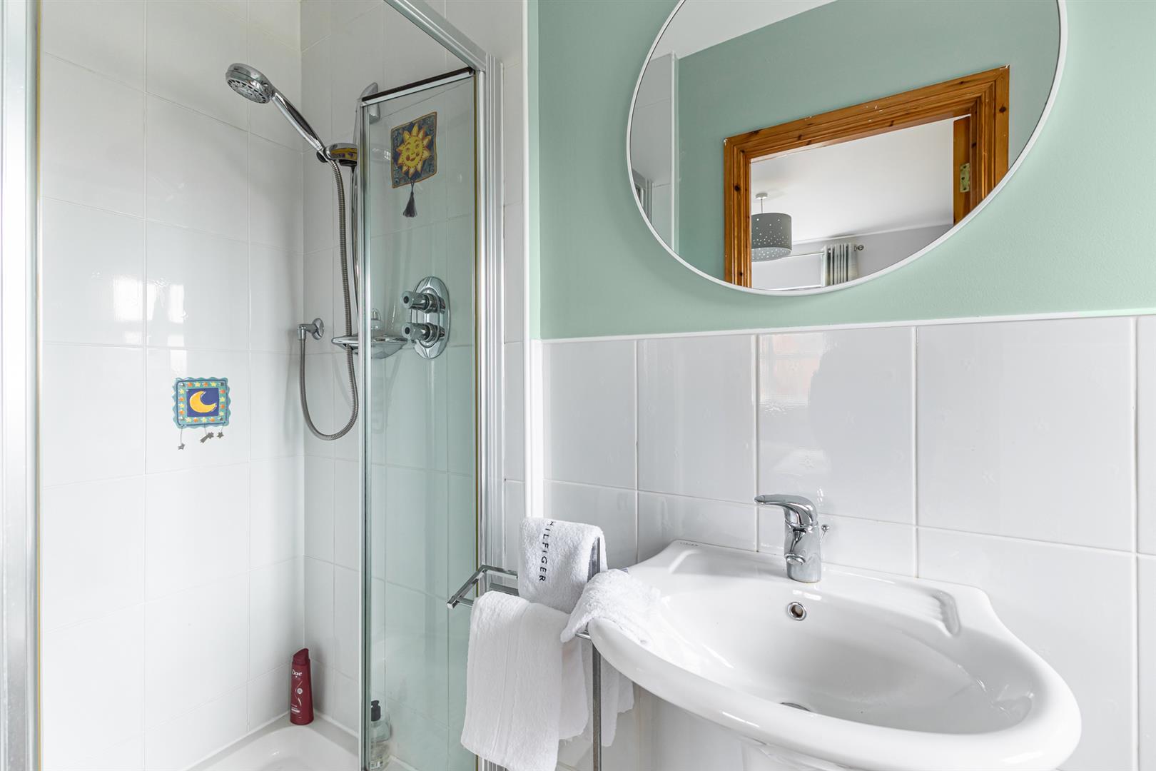 Three piece suite comprising built-in fully tiled shower cubicle, floating wash hand basin, mixer tap, low flush WC, trevi shower, part tiled walls, extractor fan.