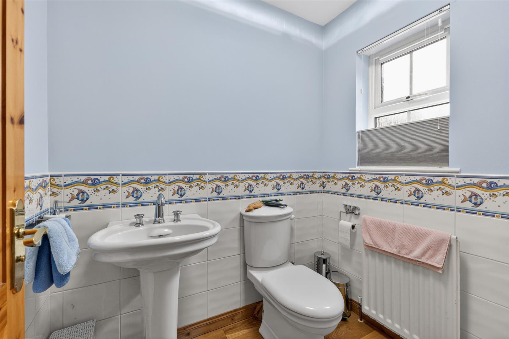 Two piece white suite comprising low flush WC, pedestal wash hand basin, solid oak floor, part tiled walls, internal door to dining/reception hall.
