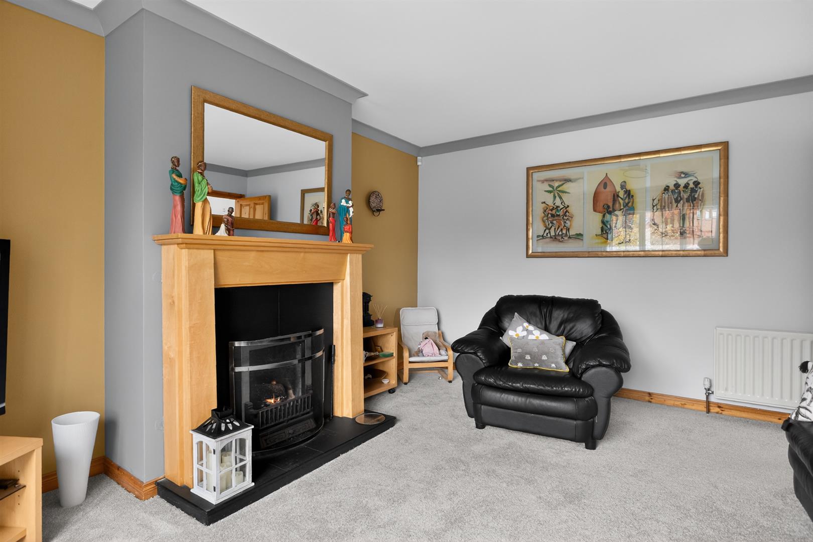 Attractive carved fireplace surround, slate inset and hearth, open fire, cornice ceiling.