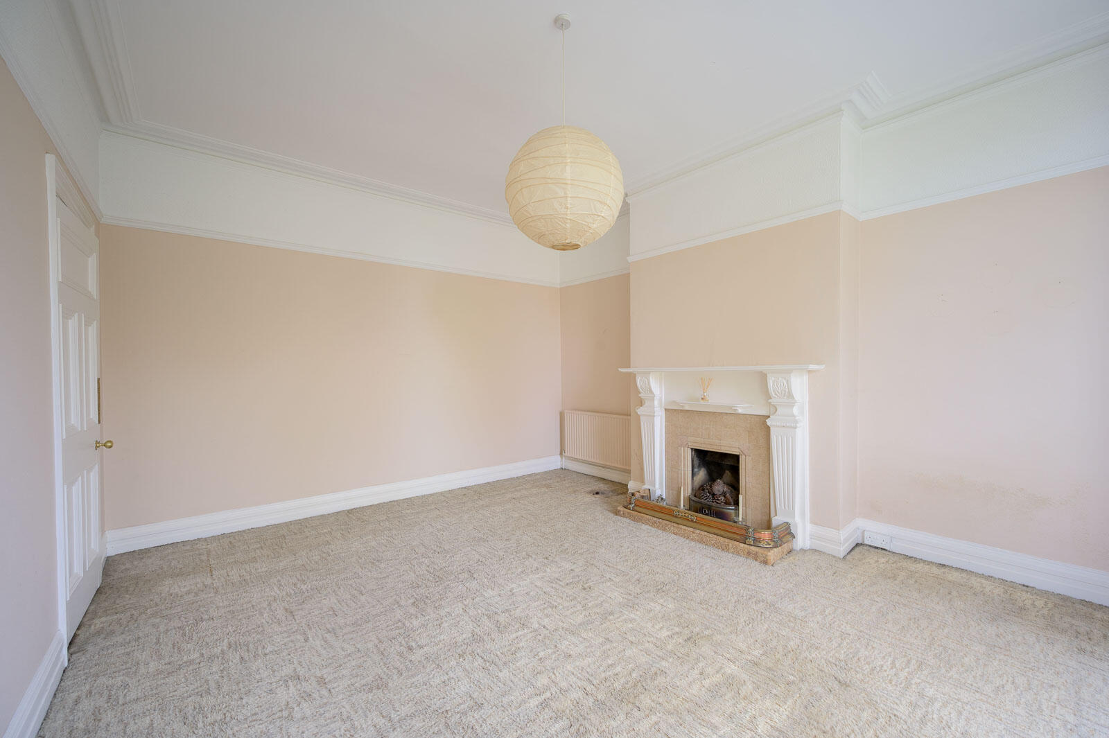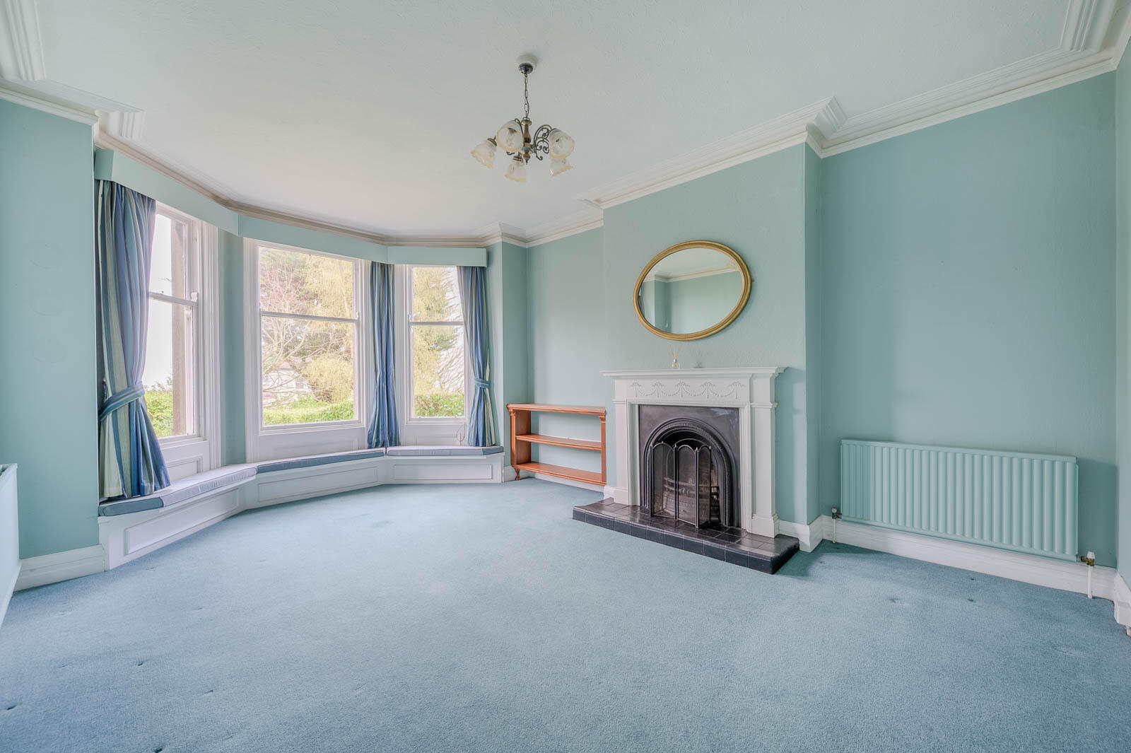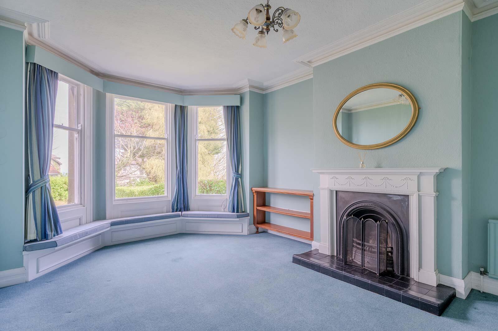With bay window, outlook to front with views across Bangor Bay to Royal Ulster Yacht Club, Ballyholme Bay, Copeland Islands and the Irish Sea to Scotland beyond, central open fire with cast iron surround, timber frame and mantel, tiled hearth.