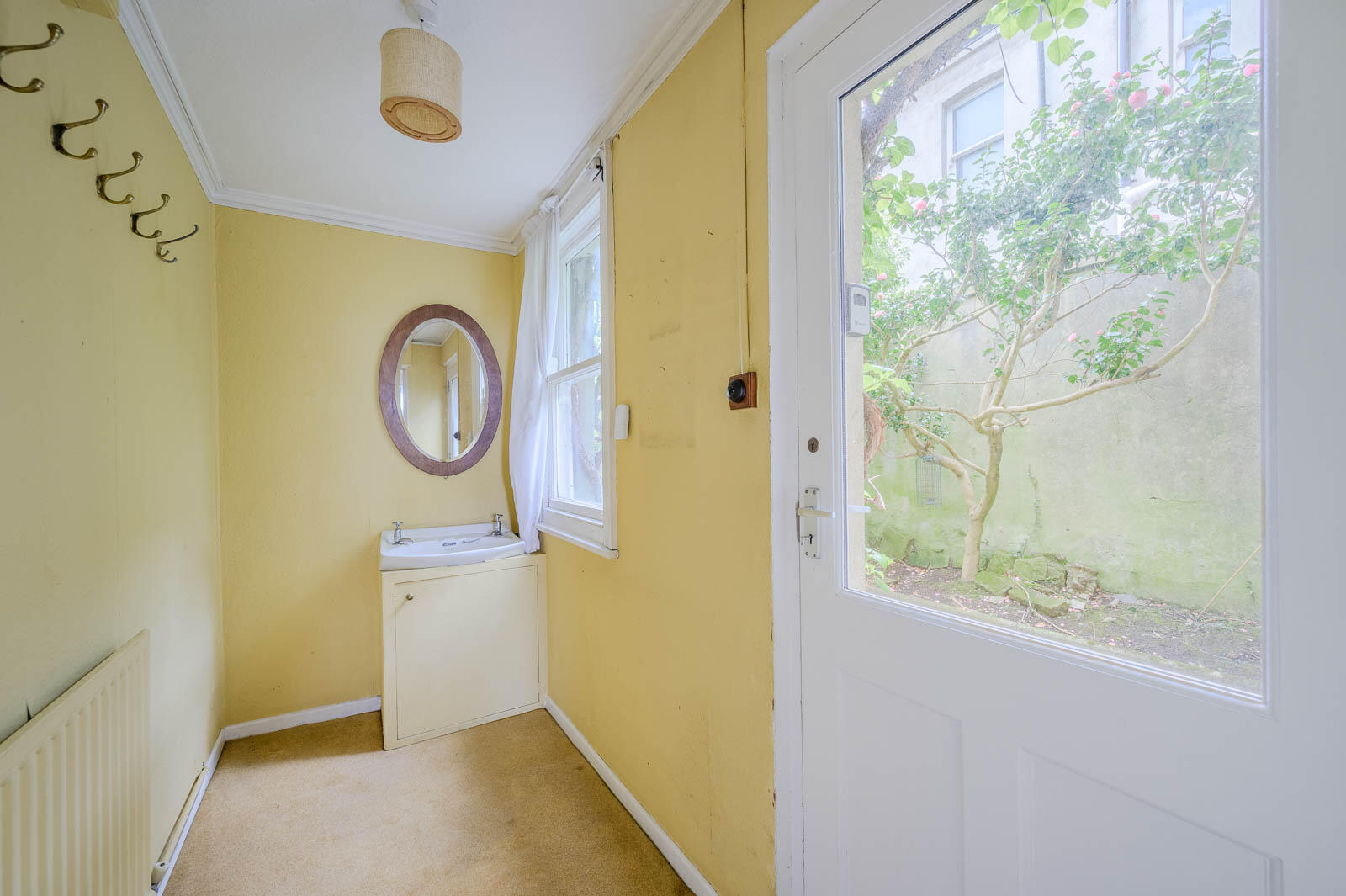 With wall hung wash hand basin, hot and cold taps, vanity storage below and access to rear courtyard.