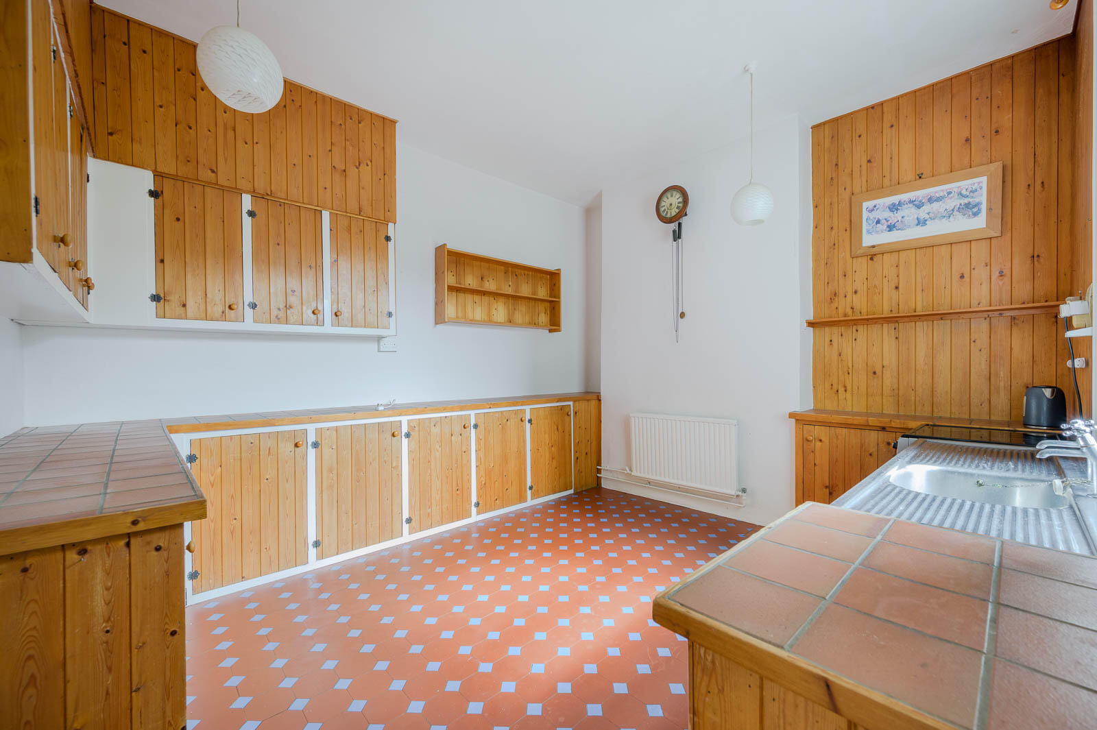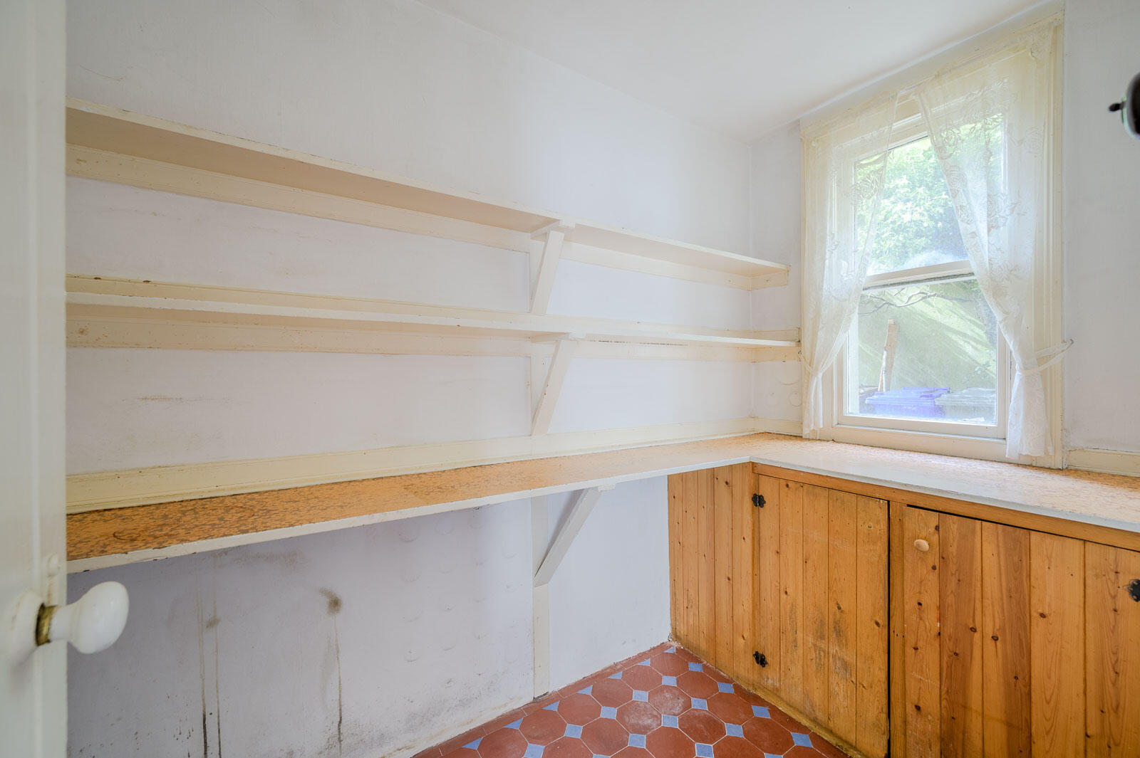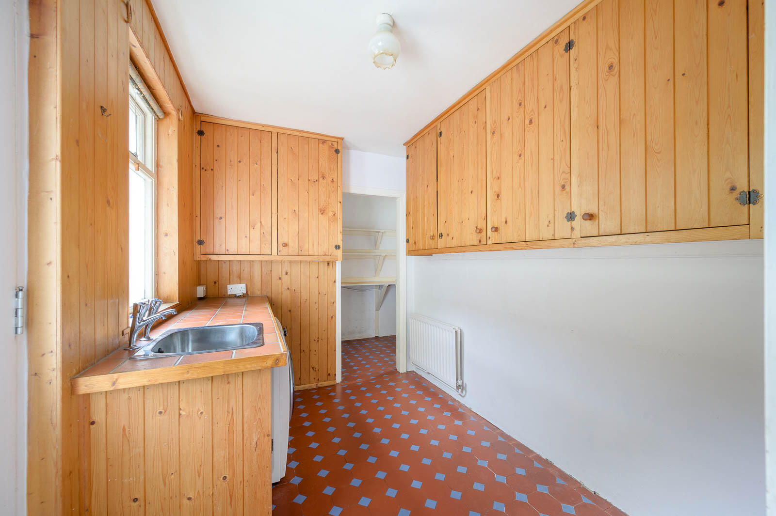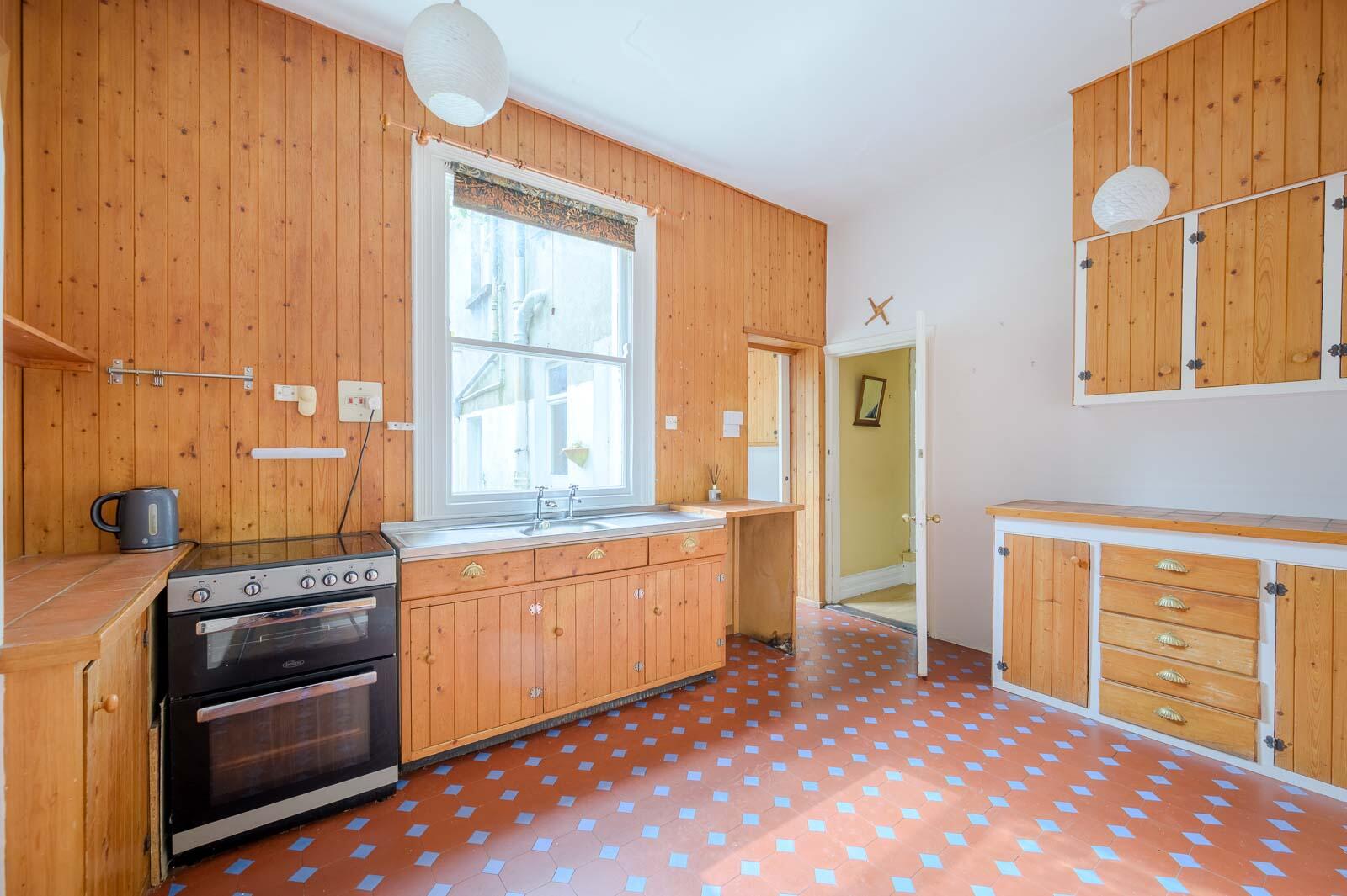 Kitchen with original tiled floor and outlook over the rear courtyard