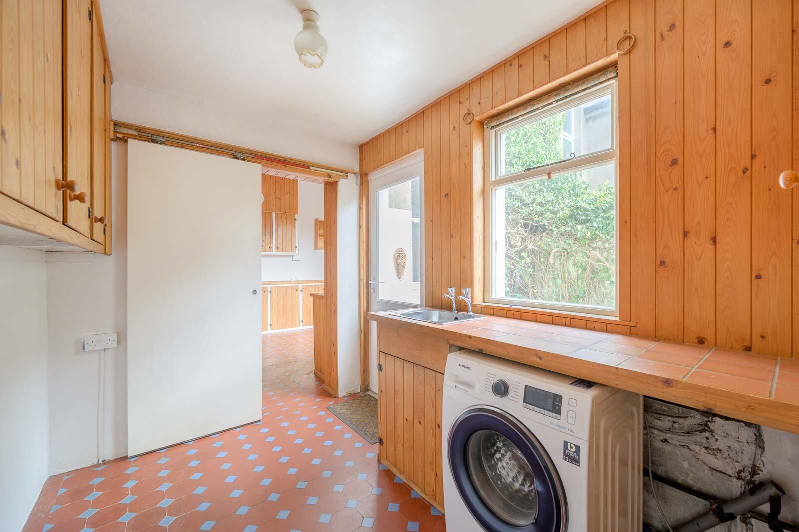 With feature tiled floor, space for fridge freezer, space for washing machine, space for tumble dryer, stainless steel sink with hot and cold taps and access door to rear courtyard.